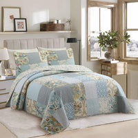 Cozy Line Home Fashions 100% Cotton Classic Patchwork Bedding Quilt Set, Blue Gray Teal Taupe Floral Bohemian Style Reversible B