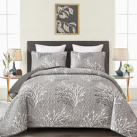 Djy Grey Quilt Set King Size - Branch Botanical Pattern Bedspread Coverlet Set, 3 Pieces Gray Floral Quilt Bedding Set, Soft Lig