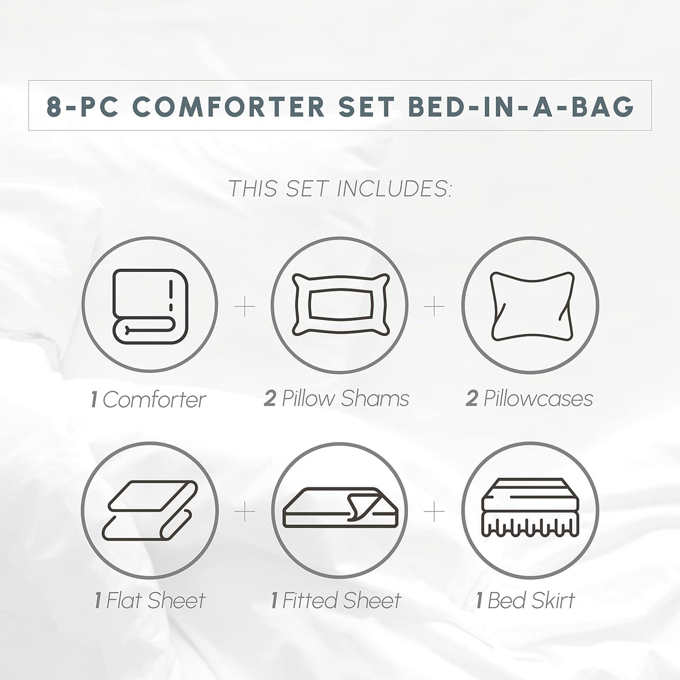Experience a fabulous night's rest with our Elegant Comfort down alternative 8-Piece Bed-in-a-bag comforter set. Baffle box type design with double-needle sewn thru construction eliminates shifting for evenly distributed warmth. Filled with down fibers for superior loft and year-round comfort. All-season comforter is cozier, softer, loftier better than down. Ultra-soft, microfiber down-alternative shell and filling provide cozy yet breathable warmth and it's machine-washable. Classic baffle-box design with double-needle stitching prevents filling from shifting and bunching. Unlike other down-alternative comforters and blankets, better than down pampers you with the softness, loft, warmth and breathability of down. Easy-care microfiber. Versatile, practical design better than down's baffle-box construction gives you warmth, comfort and loft of a Blanket while preventing the down-like tufts of microfiber inside from shifting. The smooth, piped edging and double-needle stitching create a classic comforter designed to last. Machine-washable no dry-cleaning chemicals or expensive fees.