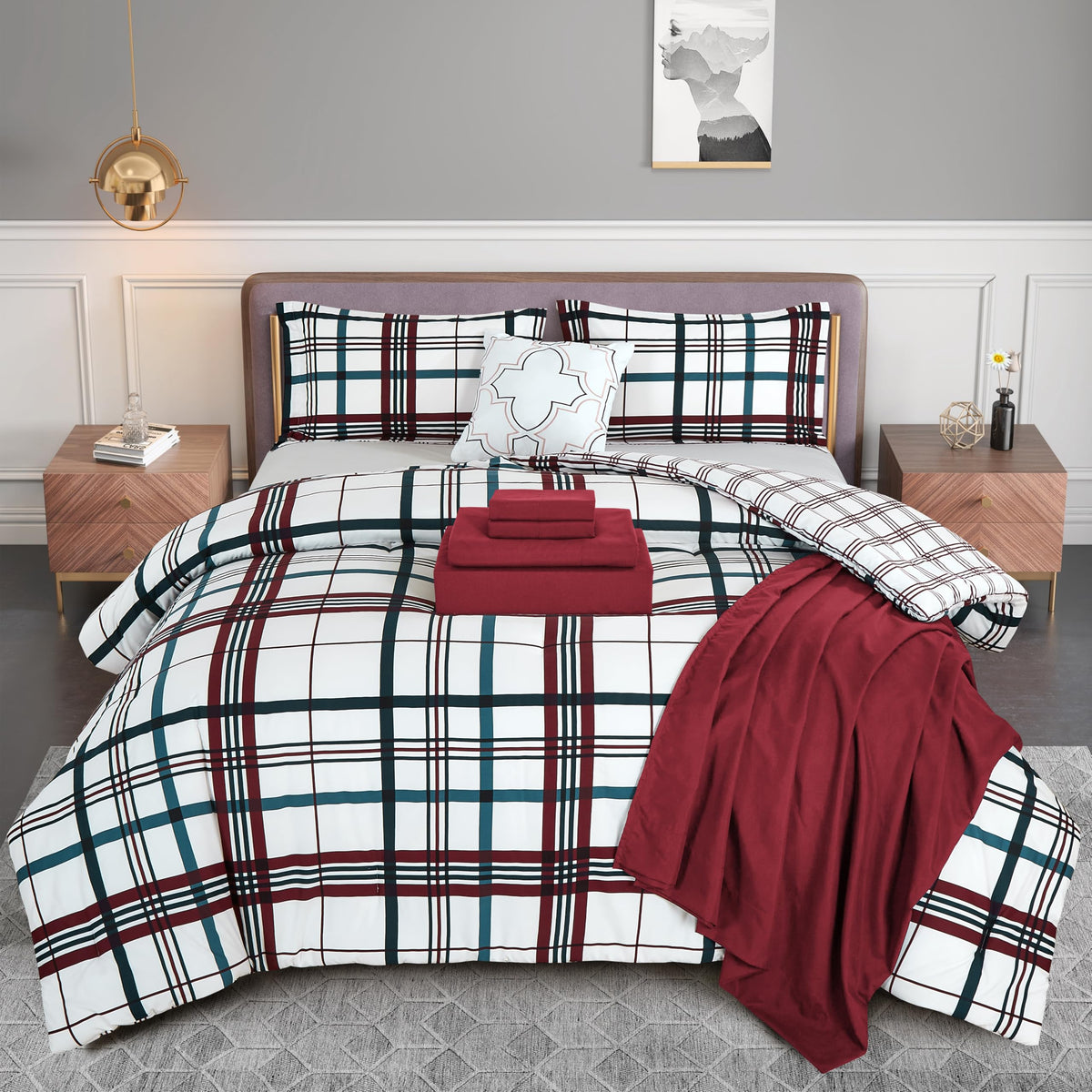 Enjoy our latest combination of style, comfort, and convenience with our Premium 8-Piece Comforter Set, a carefully crafted luxury bedding set designed to transform your sleeping space into a great room, perfect for all seasons. This all-in-one bed in a bag set includes a plush comforter, ultra-soft flat and fitted sheets, two pillowcases, two decorative shams, and an accent pillow, all in a sophisticated pattern that easily complements a wide range of bedroom decors. Engineered for both comfort and durability, the bedding set is made from high-quality 100% microfiber, ensuring a lightweight, breathable, and incredibly soft touch that helps your sleeping experience by providing warmth in the winter and coolness in the summer, making it the ideal choice for year-round use. Each piece in this set is designed to be fade and wrinkle-resistant, maintaining its great appearance and softness even after multiple washes. The versatility of this set eliminates the need for additional purchases, providing an all-in-one solution. This product is perfect for students looking to enhance their dorm room comfort, homeowners seeking to elevate their bedroom decor, or anyone in need of a versatile, high-quality bedding set that offers great value. Its elegant make it a good choice that can adapt to various interior styles, from modern minimalist to classic traditional, ensuring it remains a timeless addition to your home. Whether you're refreshing your current bedroom setup or outfitting a new space, this bedding set provides everything you need for a complete look, making it an excellent purchase for anyone seeking to upgrade their sleep environment with elegance and great comfort.
