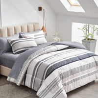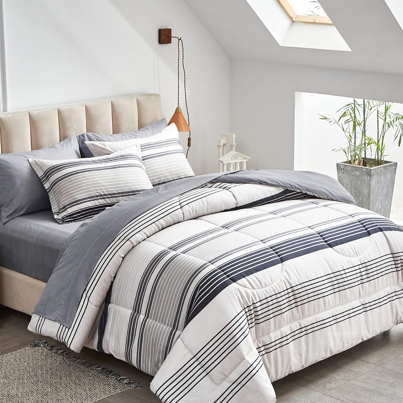 Flysheep Ombre Boho Striped Bed In A Bag 7 Piece Queen Size, Grey N Navy Black Stripes On White Comforter Sheet Set (1 Comforter