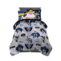 Give Him A Bedroom Fit For A Dark Knight With This Animated Bedding Set Featuring Batman From Dc Comics And Warner Bros. Bold Colors And An Action-Packed Gotham Blues Design Bring Super-Hero Style To This Soft And Cozy Bedding Set.This High-Quality Microfiber Set Includes A Comforter, Fitted Sheet, Flat Sheet, Pillowcase(S), And Pillow Sham(S). A Versatile Reversible Comforter Features A Predominantly Grey Batman And Logo Design On One Side With A Darker Blue And Black Batman Print On The Other Side. Coordinating Grey, Black, Blue, Yellow And White Colors Continue Throughout The Batman-Themed Sheets, Pillowcase(S), And Pillow Sham(S).Warner Bros. And Dc Comics Continue To Inspire New Generations Of Fans With Exciting Characters And Imaginative Storylines. Ensure Your Little Superhero Gets The Good Nights Sleep They Need To Take On The Adventures Of A New Day With Help From This High-Quality Bedding Set.Set Is Available In A Twin Size 5 Piece Bedding Set Or A Full Size 7 Piece Bedding Set.