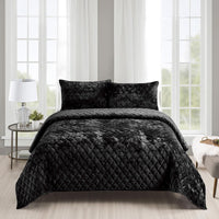 Fredsure Distressed Velvet Quilt Set, 3 Pieces Black King, Distressed Velvet Face And Brushed Microfiber Reverse With Diamond Qu
