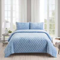 Fredsure Distressed Velvet Quilt Set, 3 Pieces Light Blue King, Distressed Velvet Face And Brushed Microfiber Reverse With Diamo