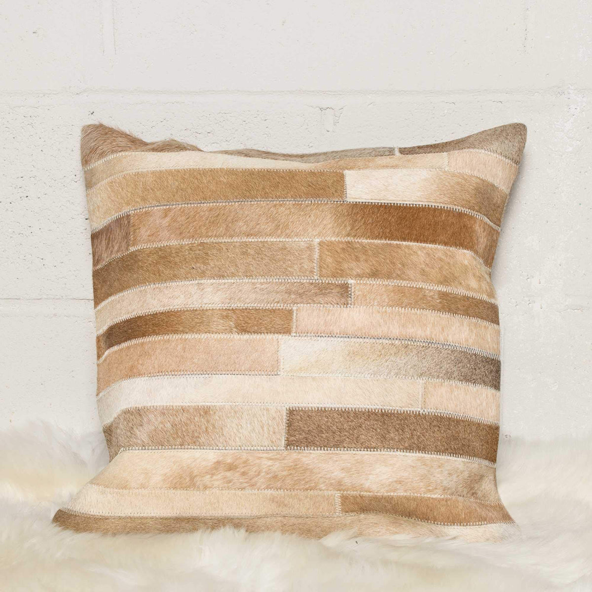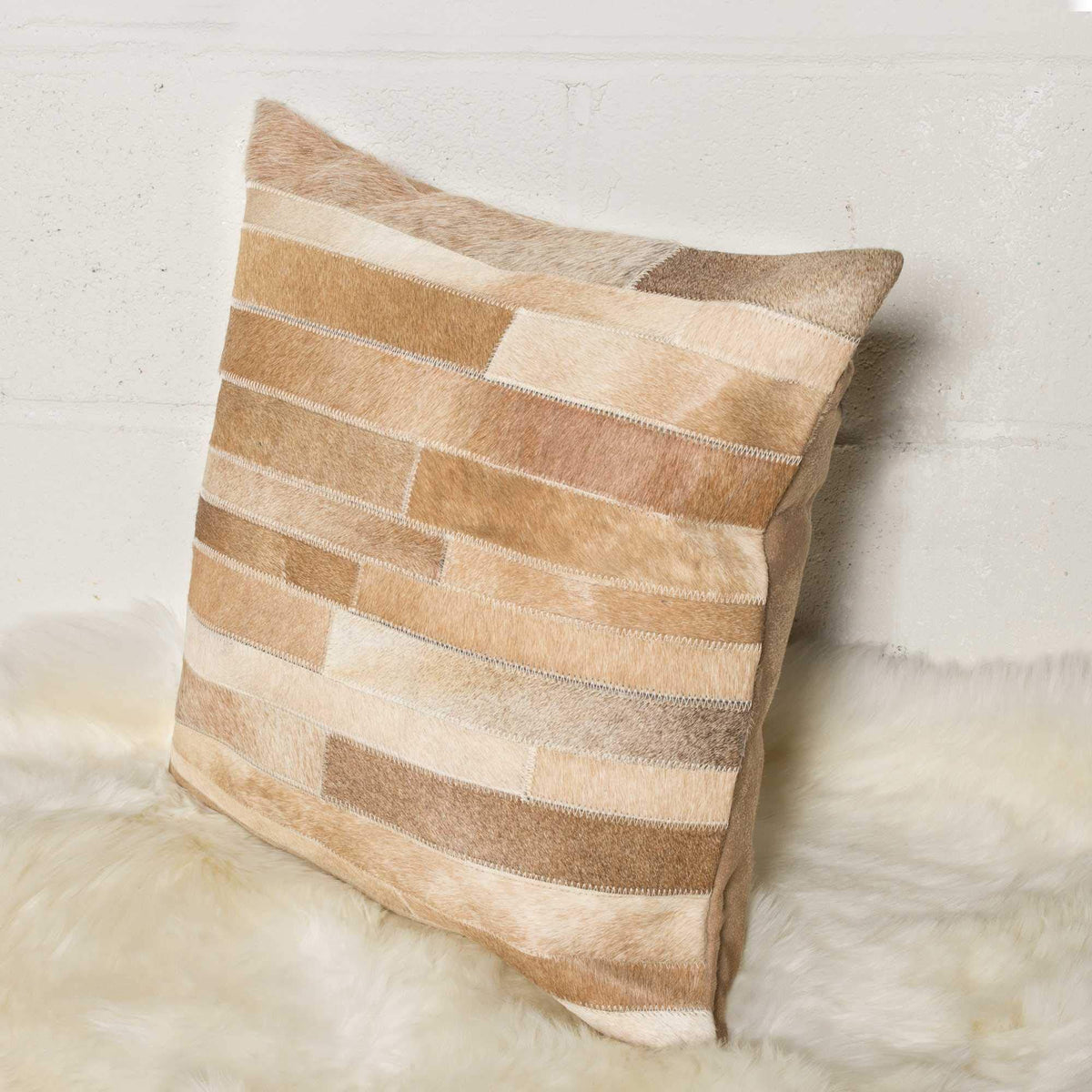 Tailored from topquality 100 indian cowhide our luxurious pillows are handcut and handstitched each panel is carefully selected for rich color and texture displaying unique mottling and variations in every piece we produce the hidden zipper closure offers a pleasing aesthetic and allows the cover to be removed for easy cleaning naturally smooth and soft to the touch these beautiful cowhide pillows are organic and oneofakind adding timeless style and warmth to any room Features. 100 natural indian cowhide. Hand woven. Hidden zipper closure. Microsuede backing. Polyfil insert. Dry clean onlySpecifications. Color Tan. Material Cowhide Microsuede Poly. Size 18 in. Dimension 5 H x 18 W x 18 D in. Weight 1 lbs
