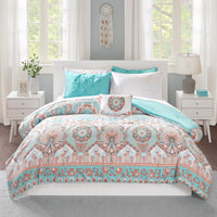 The Intelligent Design Vinnie Boho Comforter Set With Bed Sheets Offers A Fun And Fashionable Update Your Bedroom. Flaunting A Vibrant Aqua And Orange Globally Inspired Pattern, The Comforter Has A Solid Aqua Reverse That Complements The Top Of The Bed. Matching Aqua Shams (1 In Twin/Twinxl) With Pintucked Details Add Texture And Dimension, While A Coordinating Decorative Pillow Provides The Finishing Touch. A Complete Sheet Set With A Floral Print Is Also Included. This Bedding Set Is Oeko-Tex Certified, Meaning It Does Not Contain Any Harmful Substances Or Chemicals, And Hygienically Treated To Naturally Keep Your Bedding/Linen Clean And Fresh For Longer Periods Providing You With Peace Of Mind. Always Clean And Wash This Product Thoroughly Before And After Each Use