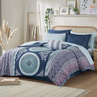 The Intelligent Design Loretta Boho Comforter Set With Bed Sheets Brings A Bright, Casual Update To Your Bedroom. A Large Medallion Print, In Navy And Purple, Runs Down The Center Of The Comforter With Subtle Bohemian Details Highlighted In White. Coordinating Shams (1 In Twin/Twinxl) With Embroidered Borders Complement The Comforter. A Decorative Pillow With Ruched And Pieced Detailing And A Solid Navy Bed Skirt Finishes The Look. Also Included Is A Complete Sheet Set That Reiterates The Bohemian Motif. This Bedding Set Is Also Oeko-Tex Certified, Meaning It Does Not Contain Any Harmful Substances Or Chemicals To Ensure Quality Comfort And Wellness.