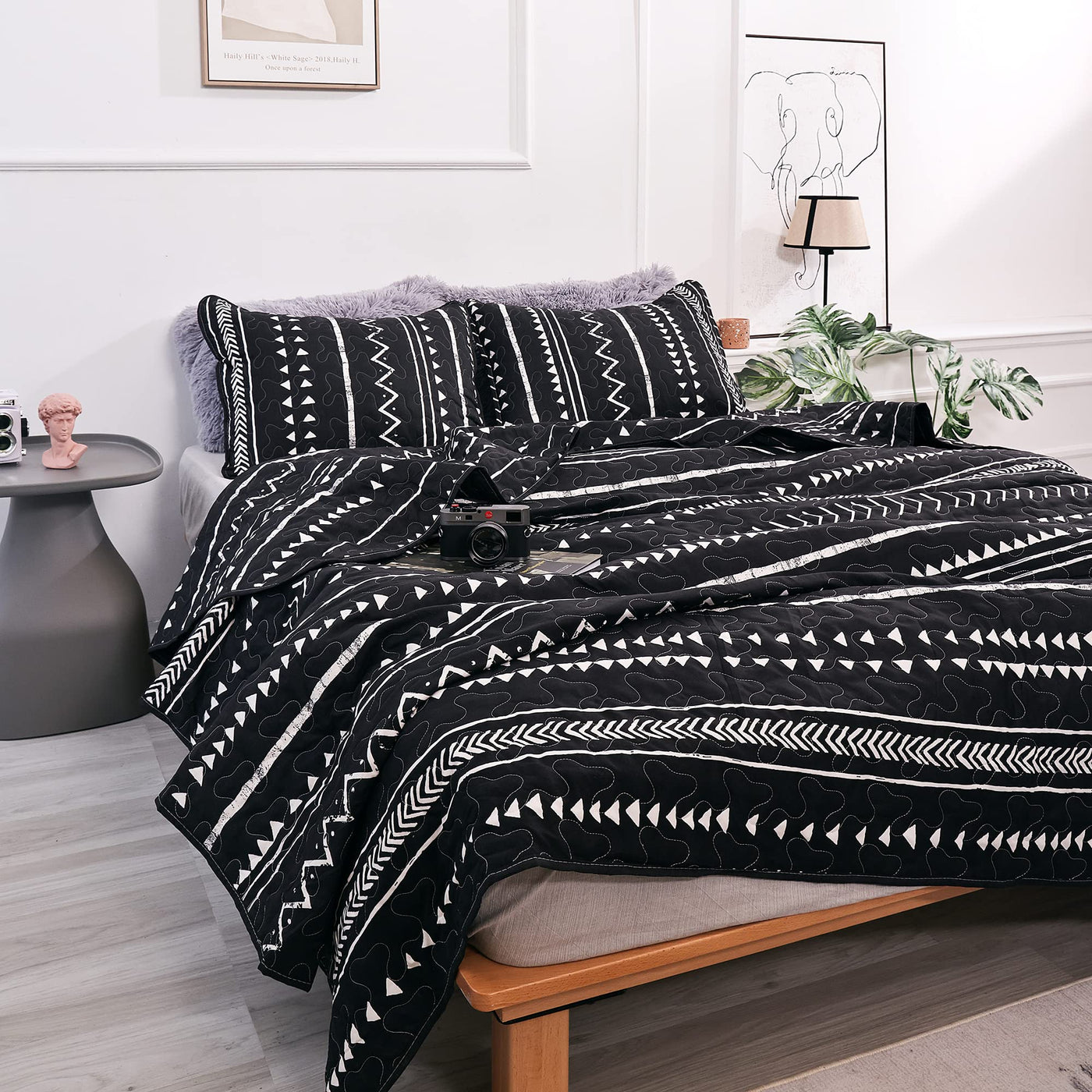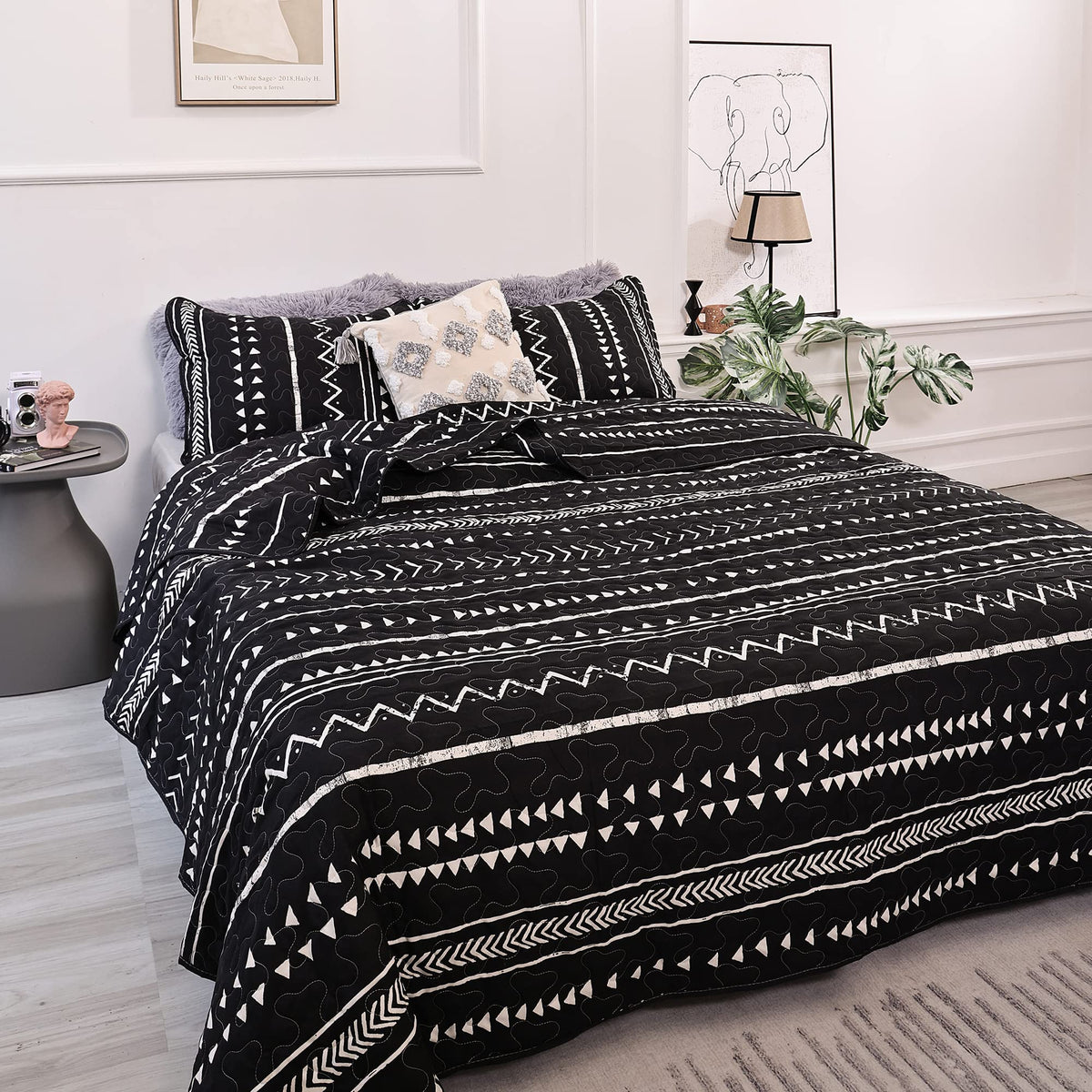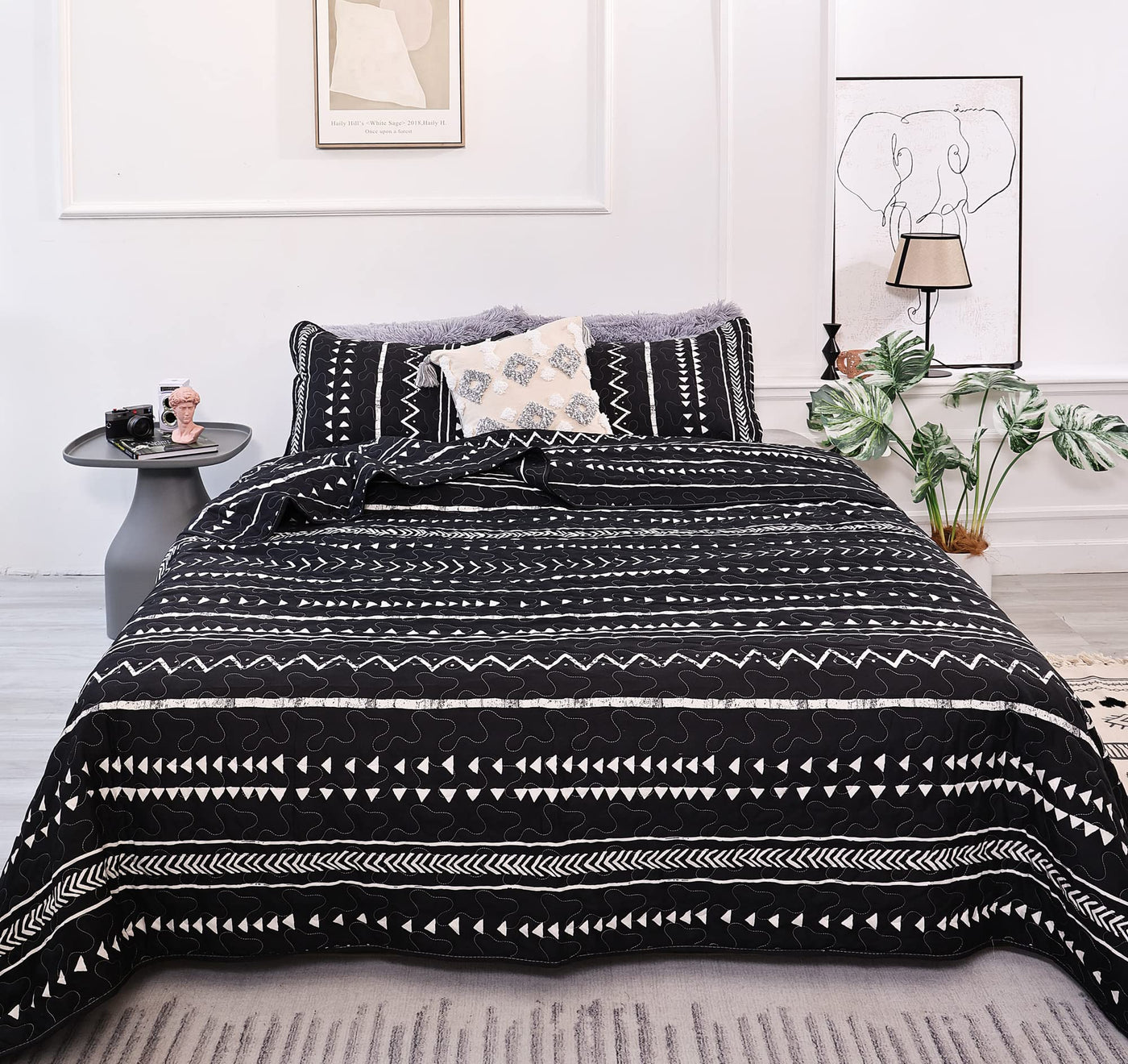 Janzaa Queen Quilt Boho Quilt Bedspread Queen Size Boho Bedding White Geometric Printed On Black Quilt For All Season(Two Pillow Cases)