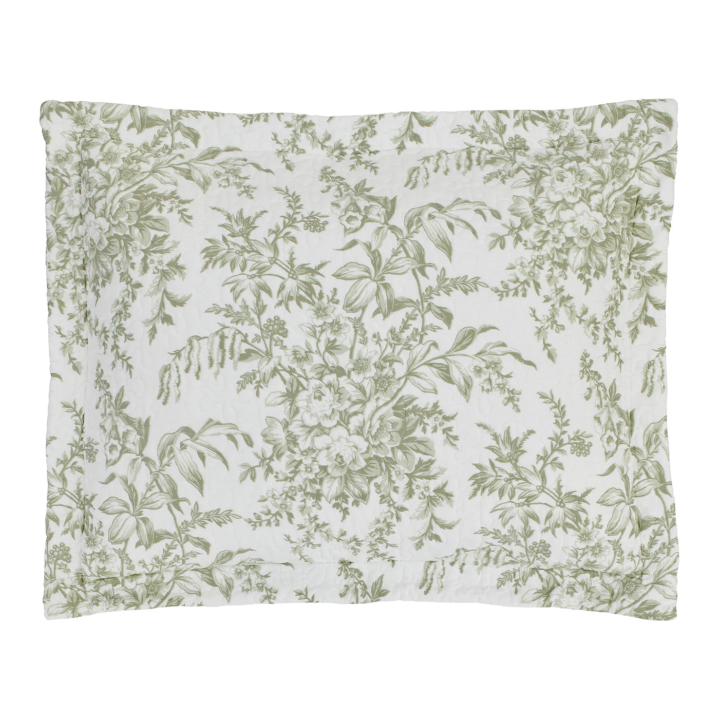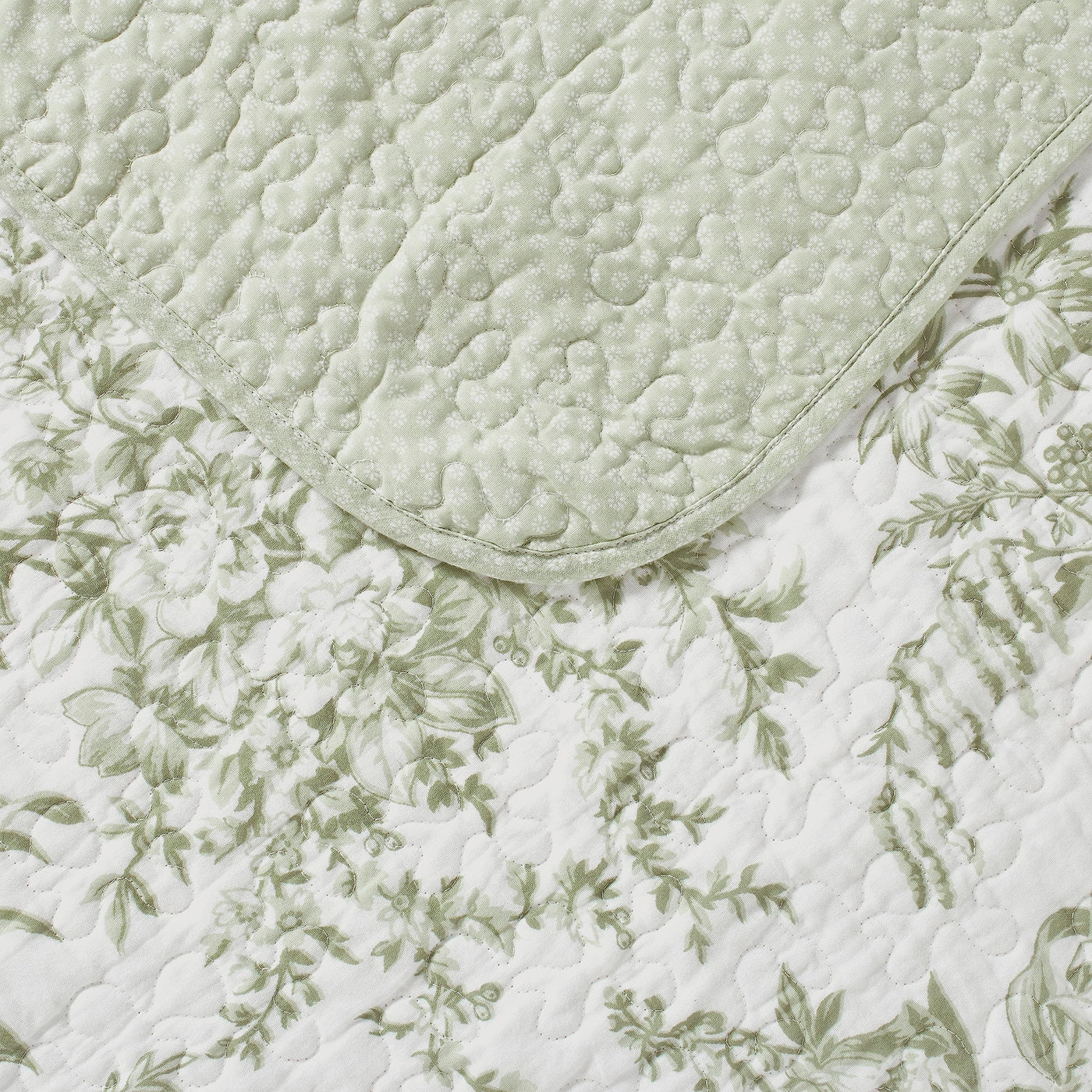 Sage green and white toile have a timeless appeal in the gorgeous Bedford Quilt Set from Laura Ashley. bedford quilt design. This classic floral gets a fresh update when paired with a simple floral printed reverse in sage and white that also binds the edges. Prewashed for softness, this 100% cotton quilt set becomes cozier with each wash. Filled with a blend of 80% cotton/20% polyester, this set is lightweight yet can be layered for year-round use. Set is machine washable for easy care.