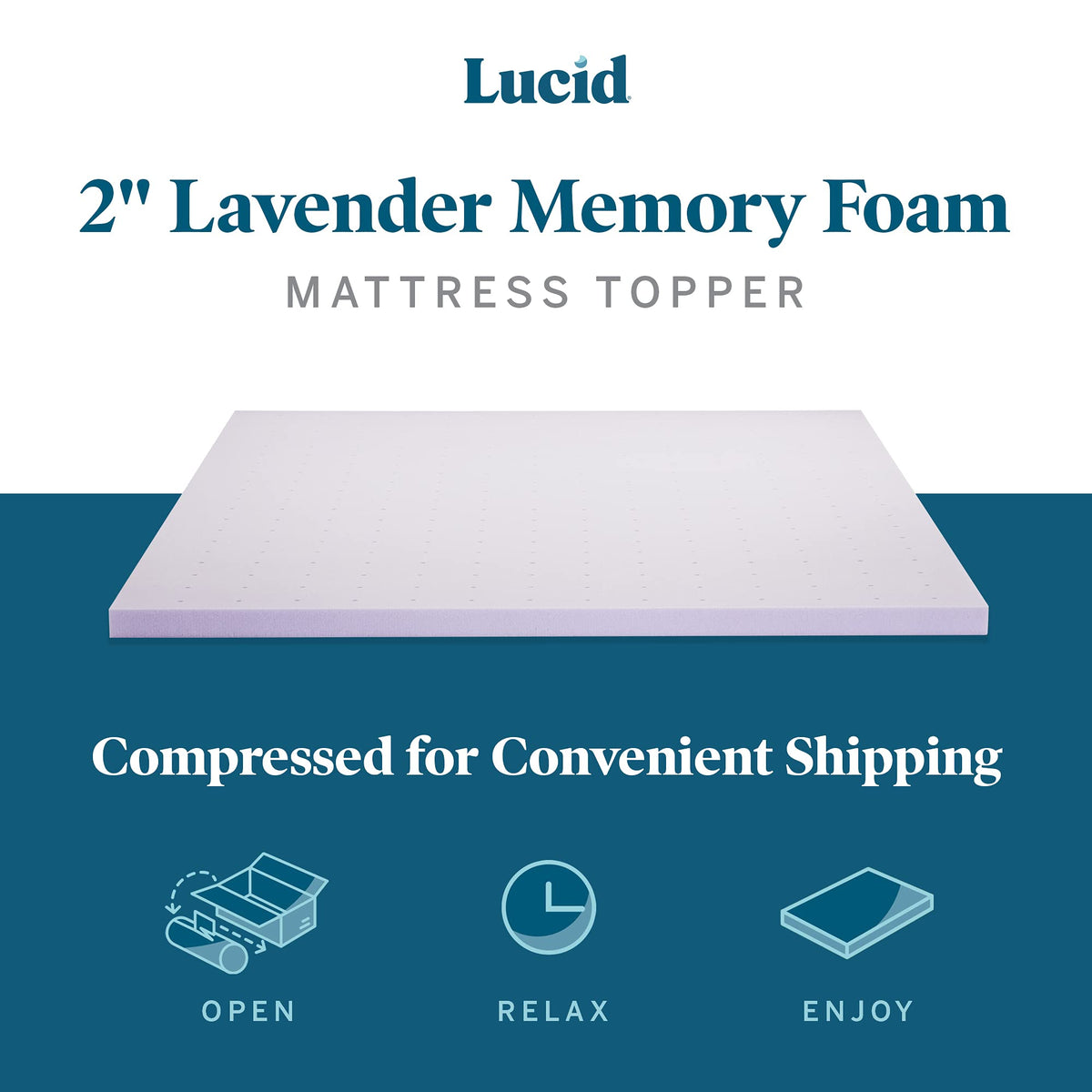 Upgrade your mattress and your life with the pressure-relieving comfort of memory foam and the relaxing scent of lavender. The LUCID 4 Inch Memory Foam Mattress Topper offers a thick and plush comfort layer that distributes weight evenly and conforms to the curves of your body to alleviate aches and pains at common pressure points. Premium, conformable memory foam is infused with lavender, which has long been used to naturally promote calming and relaxation. A ventilated design improves breathability for a more comfortable sleep surface and a 3-year guaruntees a topper that will last. California King sized mattress topper measures 71' x 83'. Memory foam conforms to the body, easing pressure at the shoulders, hips and knees