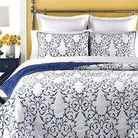 Mixinni Reversible Queen Quilt 3-Piece Blue Embroidery Pattern Elegant Quilt Set With Embroidered Decorative Shams Soft Queen Be