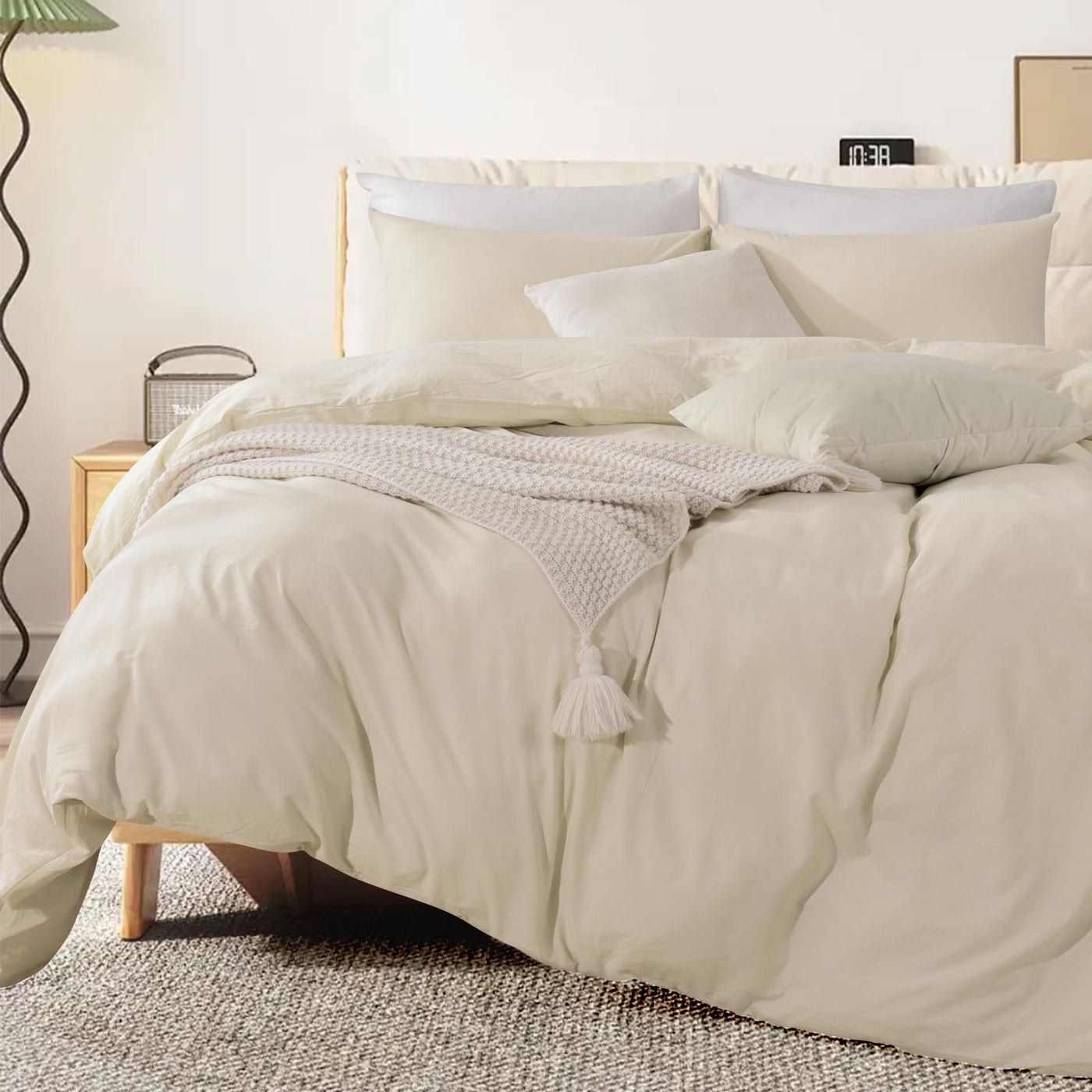 Nexhome Pro Duvet Cover Set Queen Size Linen Feel Textured Cream Grey Organic Natural 100% Washed Cotton Duvet Cover 3 Pieces Bedding Set With Zipper Closure, Breathable, Soft (No Comforter)