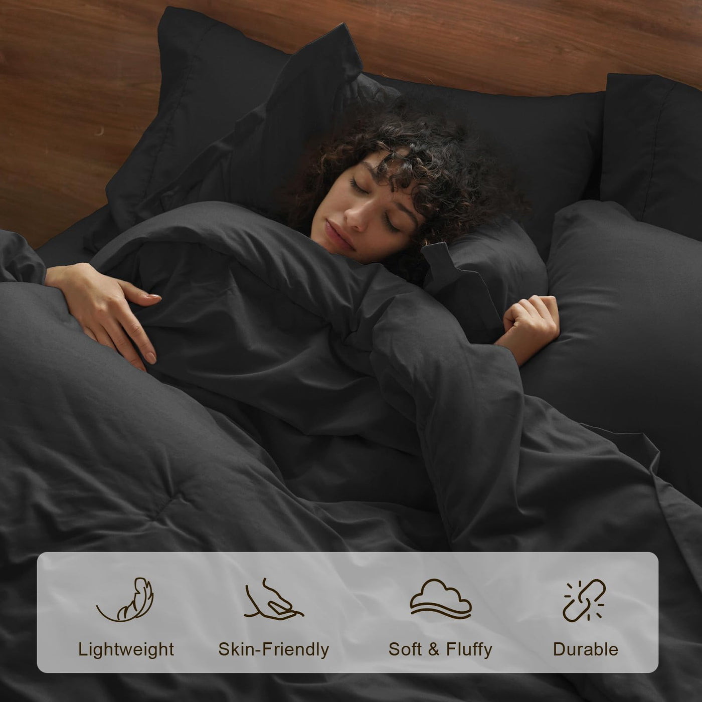 What You Can Get: 5 pack ultra soft comforter sets includes: 1x flat sheet-66'x100'+1x fitted sheet-39'x75'+16'+1x pillowcases 20'x30' + 1x comforter 68'x90'+ 1x pillow shams 20'x26'. Our bed in a bag is packaged in a vacuum bag. To restore its cozy feel after unpacking, simply tumble dry on low heat or gently tap the comforter while basking in the sun to fluff it up. | Elaborate Design: The elastic deep pocket fitted sheet fits mattress max up to 18' deep. That can always keep non-slip no matter how you twist and turn in your bed. Meanwhile the comforter set uses solid colors and a minimalist design well match any kind of decoration style | Quality and Durability: Our comforter features a surface crafted from premium synthetic fiber material that combines long-lasting durability with silky softness and excellent breathability. Meanwhile, we adopt high-grade down alternative filling blend to provide right warmth while ensuring optimal support, and is friendly to those sneezing with goose down and feather bedding. | Cloud-like Warmth: PHF comforter set with down alternative filling of the comforter creates an appropriate thickness with the right amount of weight meanwhile offer proper warmth and good puff. Not too thick, not too thin, lightweight without any rustling noise, combine with a sturdy quilting process that Securely keep your belongings in place while preserving the beauty of the design, ensuring a restful night's sleep.Enjoy all year round comfort. | Easy Care: Machine wash cold on gentle cycle with like colors. Tumble dry low. Do not bleach. No pilling, no shrink, no fade, labor tests show that the microfiber quilt set keep its shape and stay brands new after frequent wash cycles.Our bed in a bag is packaged in a vacuum bag. To restore its cozy feel after unpacking, simply tumble dry on low heat or gently tap the comforter while basking in the sun to fluff it up.
