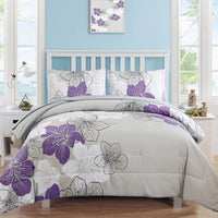 Purple Comforter Set Queen Size, Purple Floral Pattern Printed On Light Grey, Soft Microfiber 7 Pieces Bed In A Bag (1 Comforter, 2 Pillow Shams, 1 Flat Sheet, 1 Fitted Sheet, 2 Pillowcases)