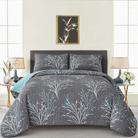 Queen Size Quilt Set Grey Blue Reversible Bedspread Bedding Set, 3 Piece Branch Floral Lightweight Microfiber Coverlet With Pill