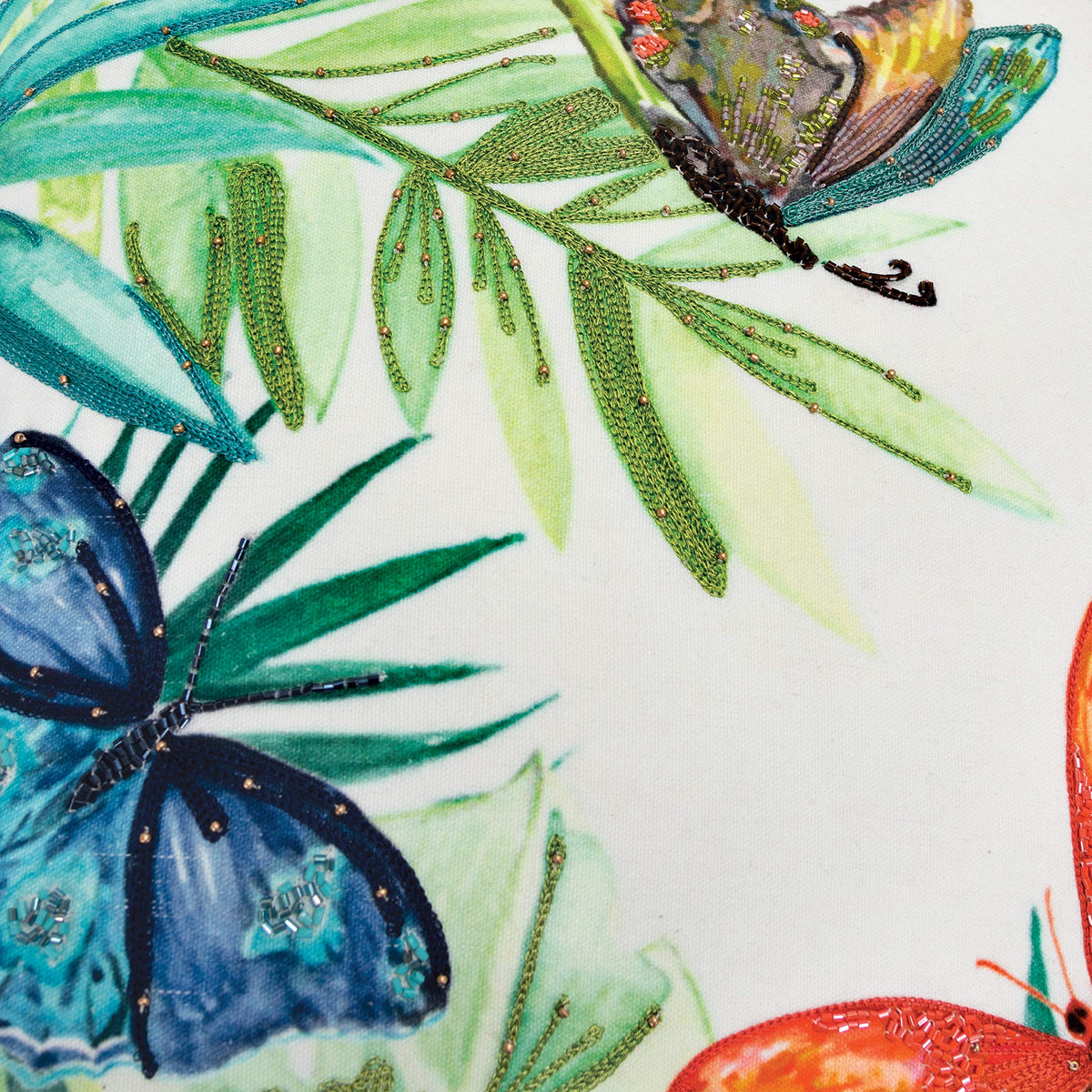 Butterflies darting about the botanical bliss of a garden are beautifully captured in thread and beading. Hand applied accents and machine embellished embroideries come together for a delightful play of the butterflies. Digitally printed to capture the magnificant color variations of their wings in flight, the embellishments give these amazing creatures dimension and artistry. Contrast welted, this pillow features a coordinating solid back with a hidden zipper closure for ease of fill.