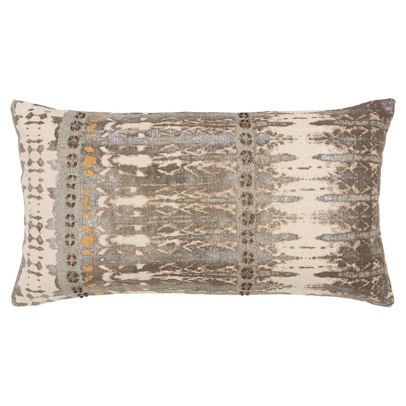 This tribally inspired distress printed pillow features an impressionsitic skin pattern. Silver foil printed accents give it just a kiss of bling. Hand beaded accents give it a light dimension. This pillow is printed on a lightly textured base which adds soft dimension to its patterning. Knife edged, this pillow has a coordinating solid back with a hidden zipper closure for ease of fill.
