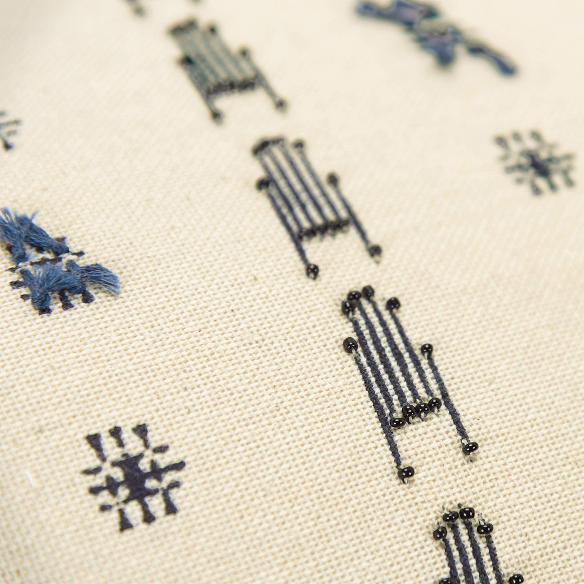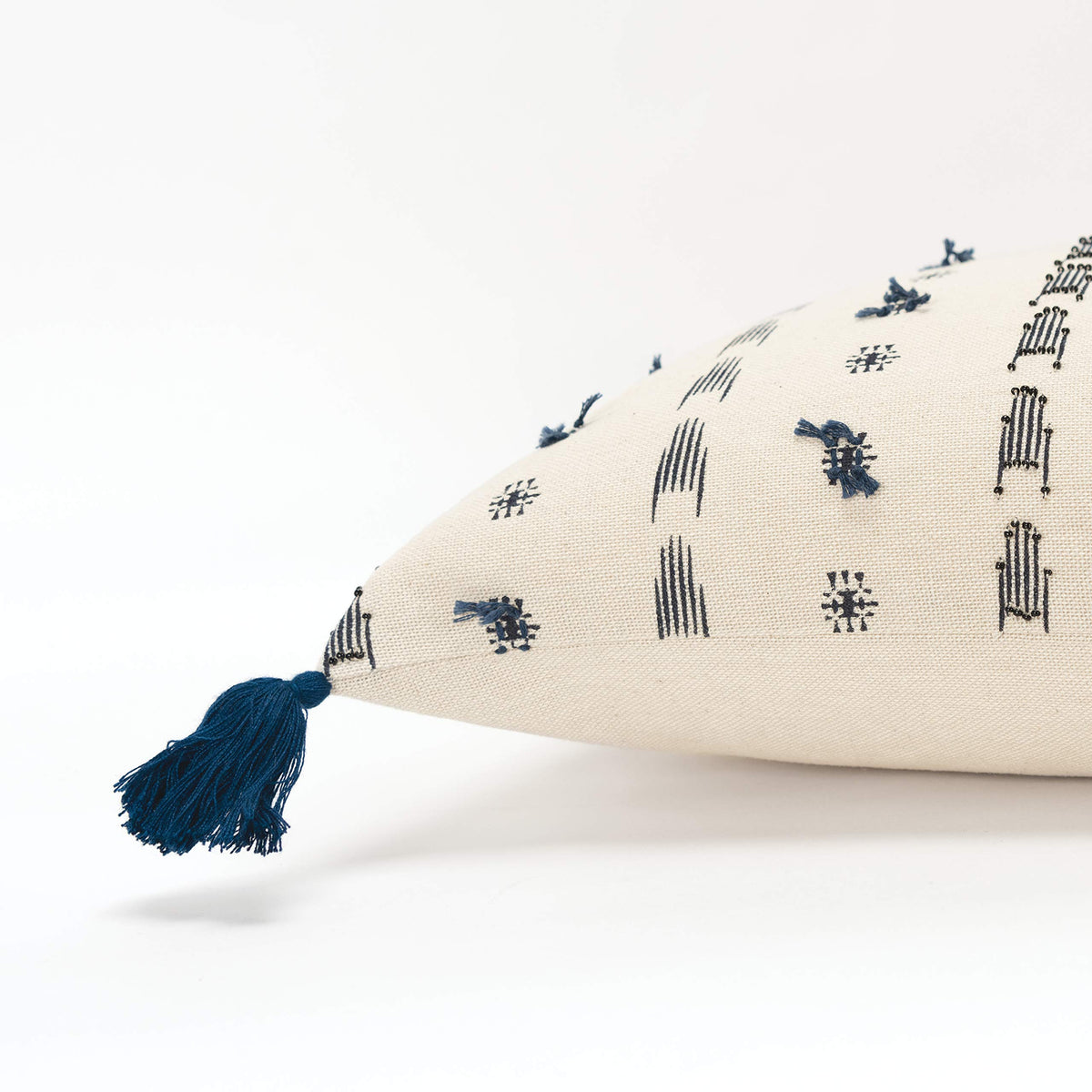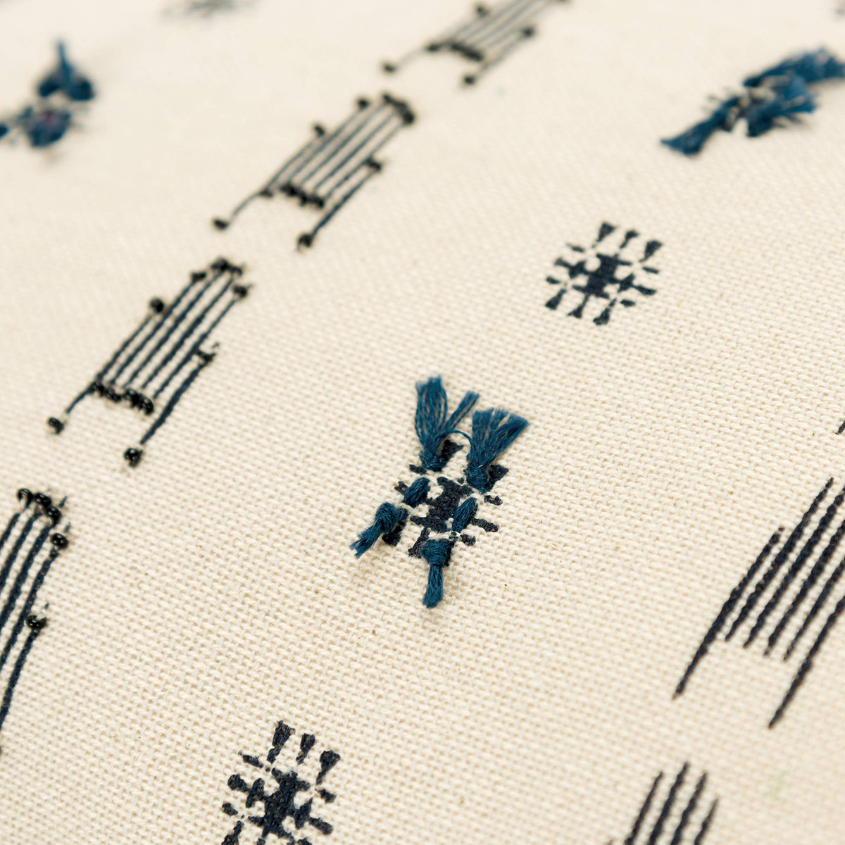Printed lines, tribally inspired- oh but how do we give this little nugget a slittle shot of texture? Let's Kantha stitich with thick coordinating threading and knot each end, leaving the clippings extended for a small eyelasy tasseled effect. And then, let's hand apply amaing dyed to match beads with just a hint of sheen. Four corner tassels and the background of this pillow being flecked give this pillow a modern updated twist. The same flecked fabric, solid, is used for the back which features a hidden zipper closure for ease of fill.
