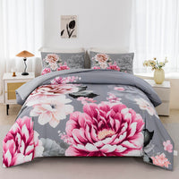 Rynghipy Grey Bed Comforter Set Queen Size 3 Pieces Pink Flowers Printed Bedding Set Soft Microfiber Comforter Sets With 1 Comfo