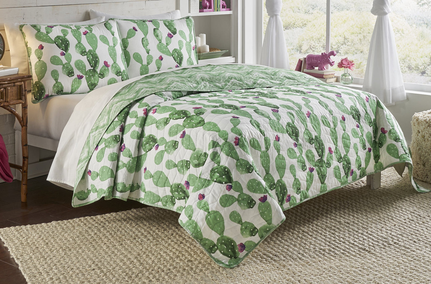 High Fashion Design Meets Imaginative And Spontaneous Style With The Vue Otto 3-Piece Reversible Quilt Set. This Trendy Quilt Features Playful Cactus Motifs With Bright Pink Blooms. Reverse Features Allover Watercolor Chevron Print. Twin Xl Quilt Set Includes One 68X90 Reversible Quilt And One 20X26 Standard Sham. Full/Queen Quilt Set Includes One 90X90 Reversible Quilt And Two 20X26 Standard Shams. King Quilt Set Includes One 102X90 Reversible Quilt And Two 20X36 King Shams. Shams Are Random Cut, But Match In Pairs. Set Is 100% Cotton. Machine Washable.