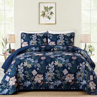 Wongs Bedding Quilt Set Queen Size, Navy Blue Botanical Queen Bedspread Bedding Sets, 3 Pieces Floral Quilt With 2 Pillowcases,S