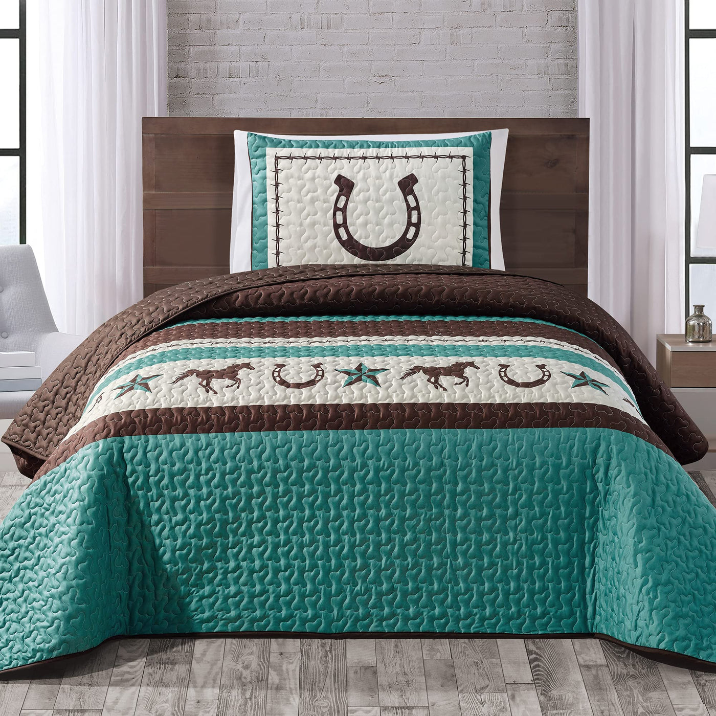 Wpm World Products Mart Western Teal/Beige/Brown Horseshoe, Horse, Barb Wire Cowboy Print Twin Size Bedspread 2 Piece Southweste