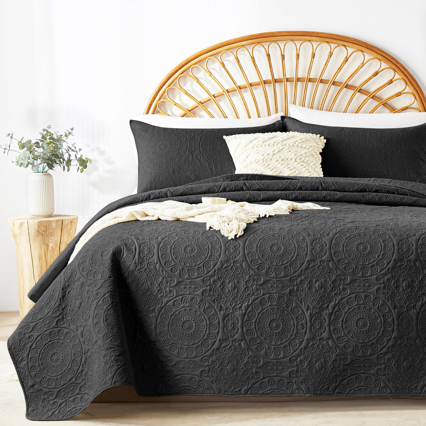 Wuruibo Black Quilt Set Queen Size, Embossing Microfiber Full Bedspreads With Pillow Sham, Ligthweight Breathable Thin Coverlet,