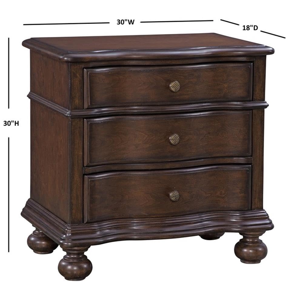 You can almost hear the lull of the ocean waves with the addition of the Rodanthe Bedroom Collection to your home. The rich tobacco finish creates a warm and familiar environment, while the sculpted wave effect adorns the front of the case pieces. Drawers feature full extension roller bearing side glides, and finished interiors for safe storage of your favorite things. The Rodanthe Nightstand features 3 spacious drawers with felt lining in the top drawer for your delicate items. Your purchase includes one three drawer nightstand.Features:Hardwood Solids and MDFRich Tobacco FinishUnique wooden knobs with woven pewter insetDrawers feature finished interiorsDust Proof Cases To Protect The ContentTop drawer is felt lined to protect your finer thingsFull Extension Roller Bearing Side GlidesSculpted Wave On CasesWooden knob hardware with woven textured metal inserts adds a designer touchDetailed molding wraps around the sides for added valueSpecifications:Product Dimensions: 30"W x 18"D x 30"HProduct Weight: 40 lbs.