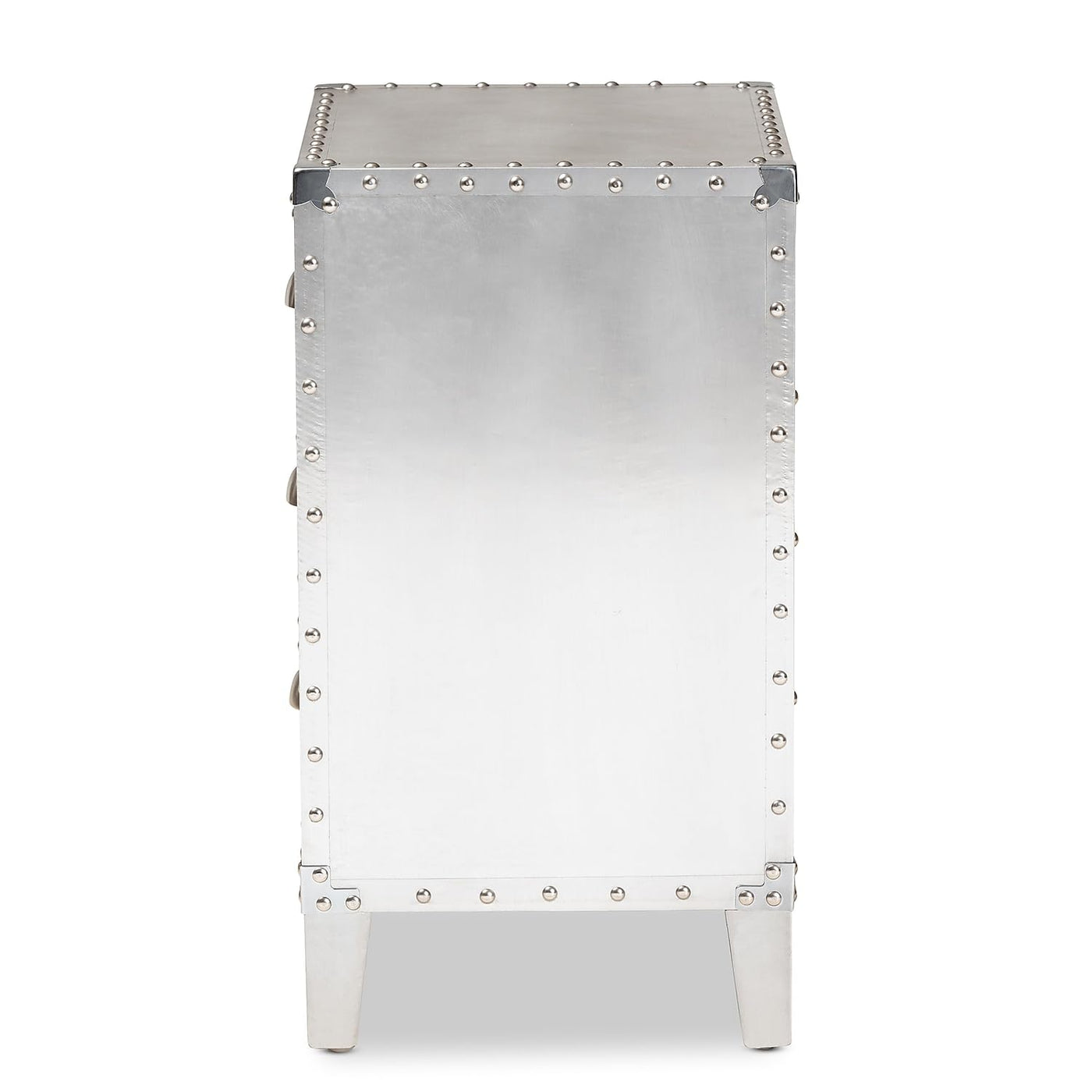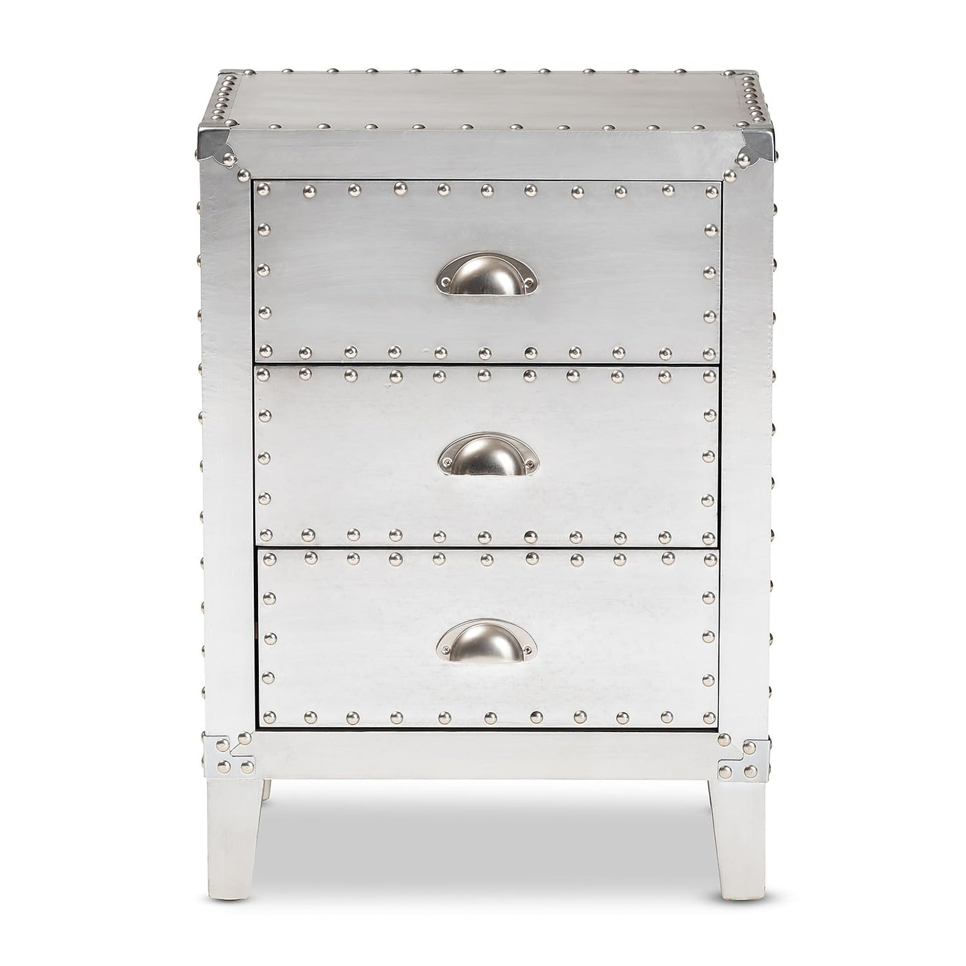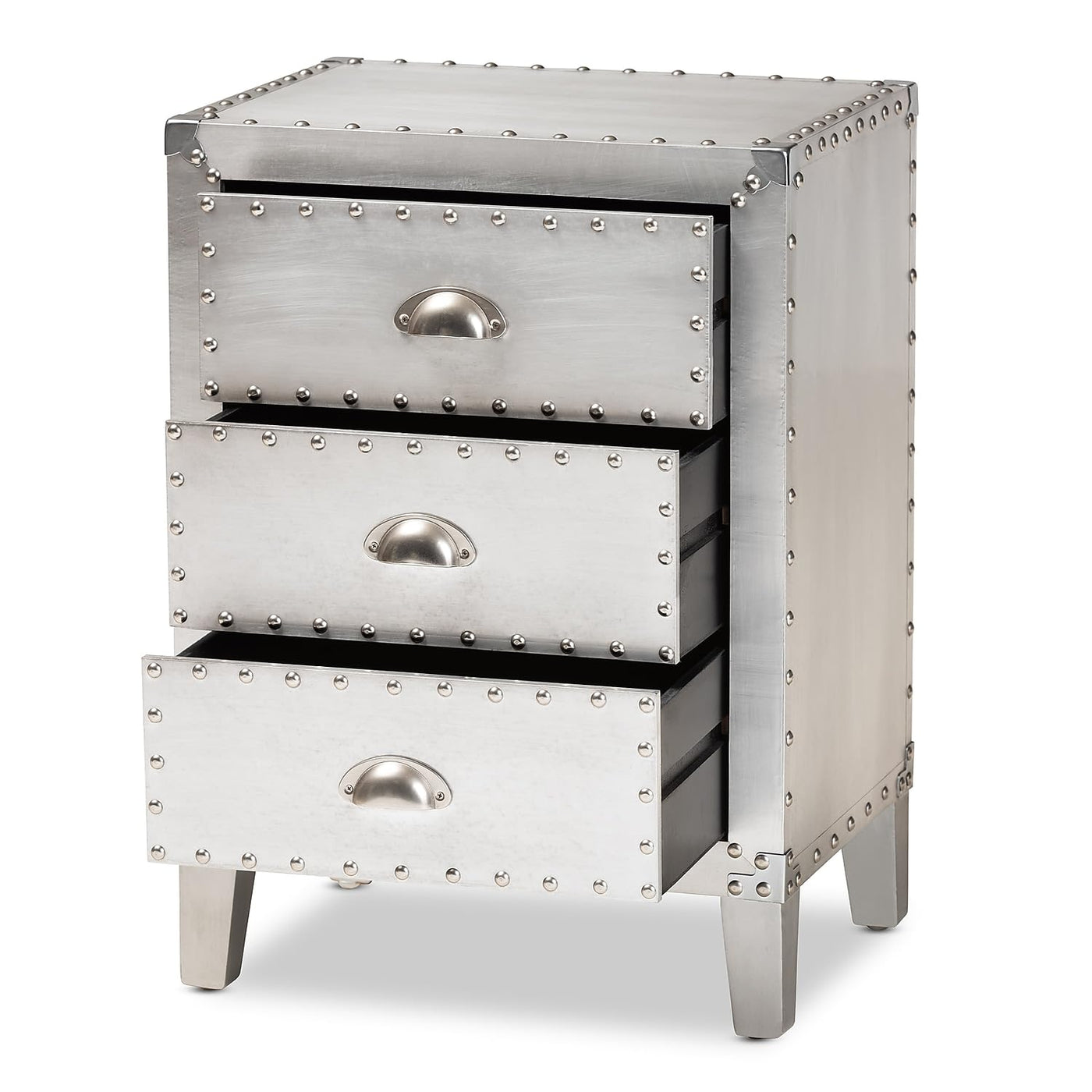 - French industrial accent end table. - Constructed from wood and metal. - Silver finish. - Three (3) drawers. - Rivet detailing. - Fully assembled. - Dimensions: 24.8" High x 17.72" Wide x 13.78" Deep; Drawer: 13.39" High x 11.02" Wide x 4.92" Deep;.