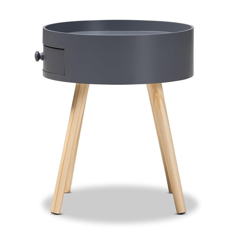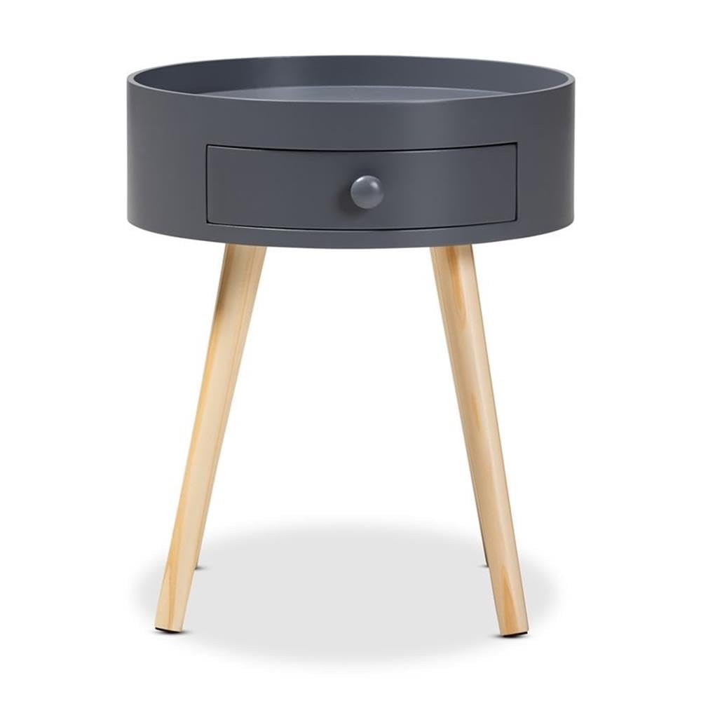 Give Your Bedroom A Personal Sense Of Style When You Add This Mid-Century Modern Round Wood One-Drawer Nightstand From Jessen Collection By Baxton Studio. It'S Crafted In An Elegant Gray Finish Over Mdf And Pine Wood Construction And Three Angled Legs. The One Storage Compartment Is Spacious Enough For Extra Linens And Other Accessories.