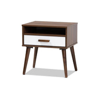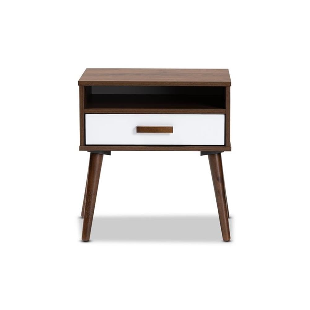 Baxton Studio Quinn Mid-Century Modern Two-Tone White and Walnut Finished 1-Drawer Wood End Table