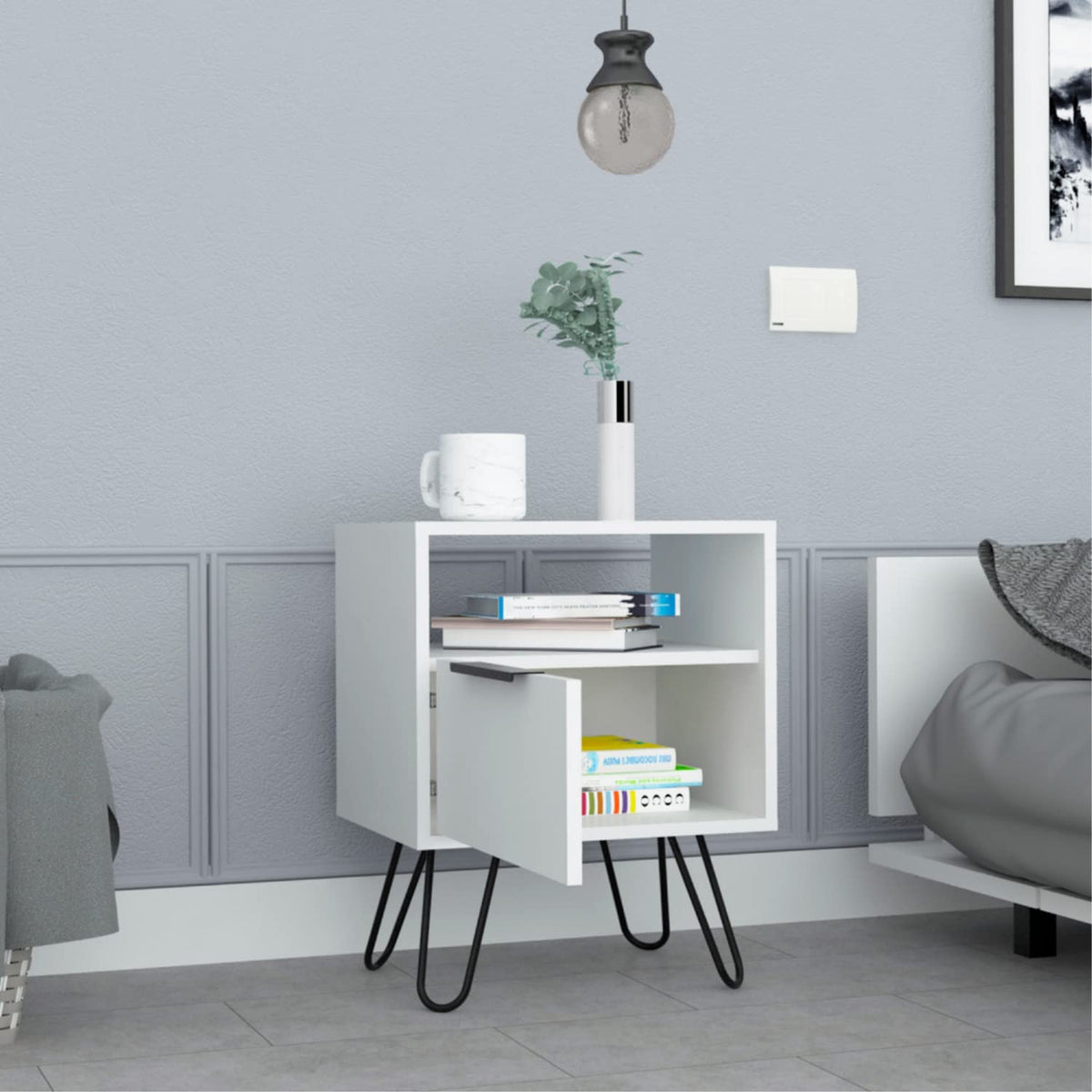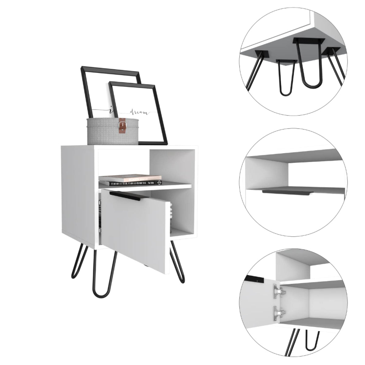 Begonia Nightstand With 2 Shelves, Single Door Cabinet, 4 Hairpin Legs, White