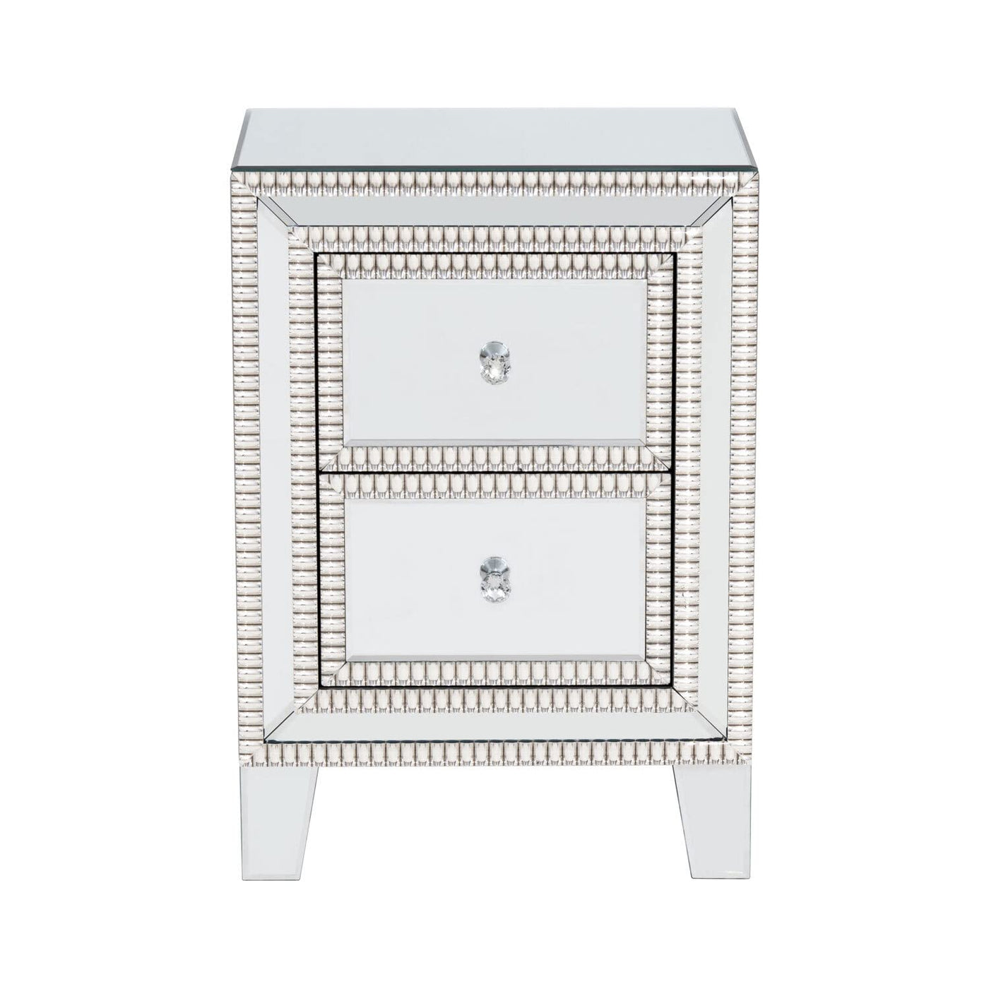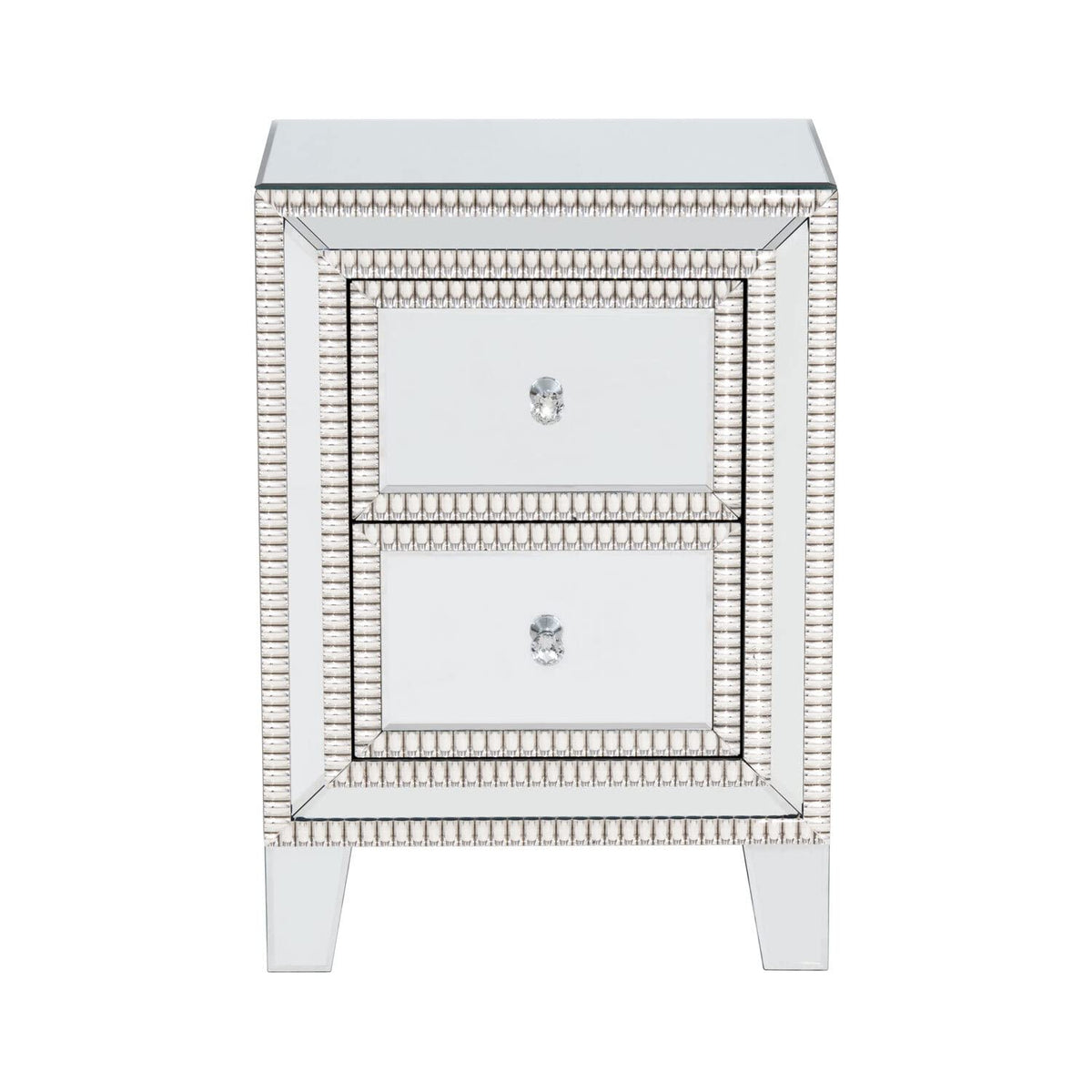 This Better Home Products Mirrored Nightstand will add light, sparkle, and luxury to your bedroom, as well as space for storing your personal items. Constructed of MDF and encased with mirror. This product is a good size bedside table for your every day's convenience. Three drawers, with a soft closing feature, provide ample storage in your bedroom. Decorated with crystal drawer handles. The sleek and modern design is sure to add a touch of sophistication to any space. Plus, there's room up top for your charging station and an accent lamp to complete the effect.