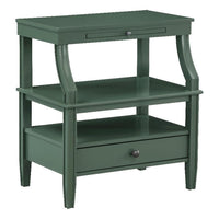 Featuring classic black hardware, on a vintage green wood finish, the Newton Vintage Green Storage Nightstand offers warm, inviting elegance for any decor. The spacious shelves are perfect for storage or use to display treasured items. One drawer for storage and a convenient pull out tray with a laminate finish that will protect against scratches and moisture. Whether in the bedroom as a nightstand or the living room beside your favorite chair, this nightstand will be the perfect complement. Your purchase includes one (1) nightstand.Features:Poplar Solids, Plywood, and MDFBlack drawer hardwarePull out laminated tray with metal knob for additional spaceFluted leg designTapered feetStorage drawerAmple shelf spaceFloor glides to protect your floorsSpecifications:Product Dimensions: 23.75"W x 17"D x 26.75"HProduct Weight: 40 lbs.