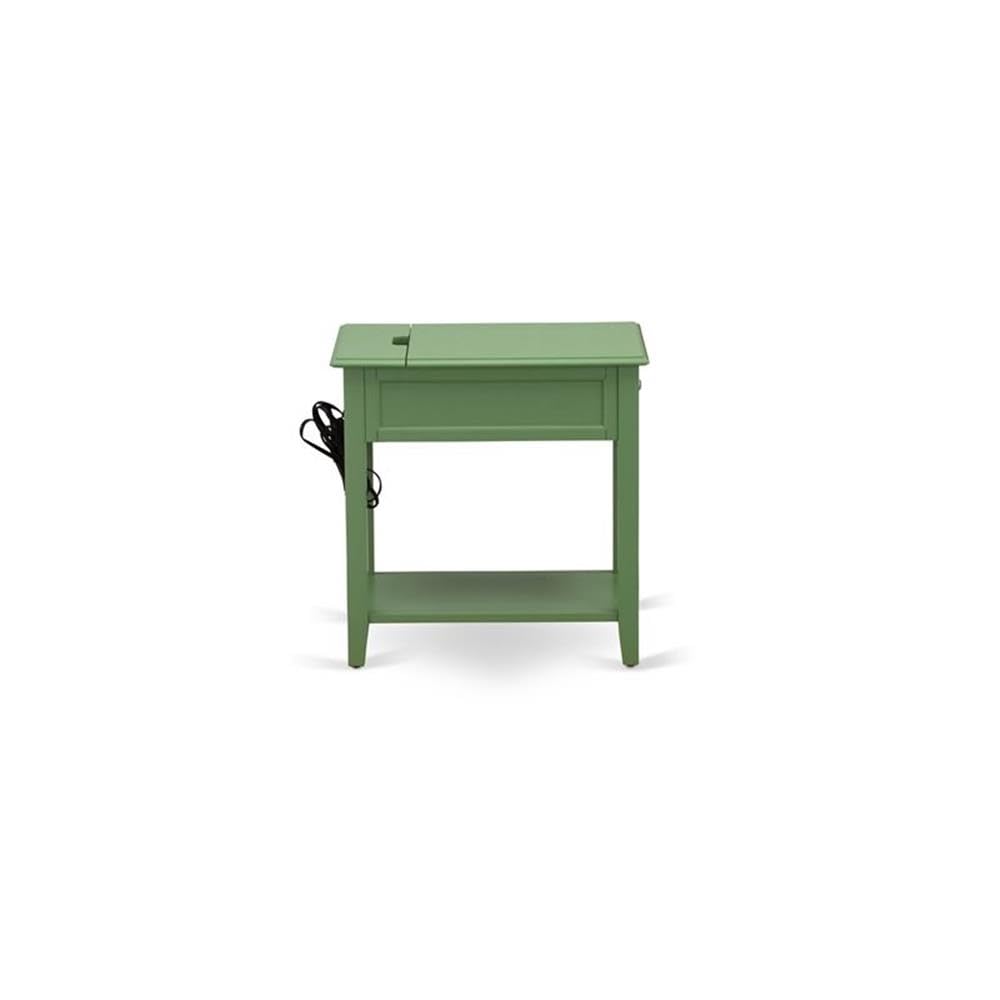 EAST WEST FURNITURE - DE-12-ET - MID CENTURY MODERN NIGHTSTANDThis modern wooden nightstand can add a stunning touch to any home. We have a wooden nightstand available in Clover Green Finish that boasts a rich and sturdy color. Not only does this beautiful piece of furniture look good, but it also creates a safe and reliable space for all your room necessities. Equipped with 2 USB fast charging ports and two outlets, it allows you to charge your mobile phones and other devices, and even plug in your computer or laptop. The bedroom nightstand is made of Rubber Wood, which makes it sturdy and long-lasting. With exquisite workmanship and four evenly stressed legs, the overall frame structure is solid and stable. Additionally, the nightstand features a useful bottom shelf where you can keep your most read books and magazines within reach. This beautiful nightstand is low maintenance and a great choice for budget-conscious families. It requires simple assembly, and all hardware and tools are provided. The nightstand is quite easy to clean and always adds great appeal to your home decor.PRODUCT FEATURES: Material: Asian Wood Color: Clover Green Dimensions of Night Stand: Length: 23.7; Width: 15.7; Height: 24. 2 USB Ports and 2 Outlet Ports AvailablePackage Included: 1 Mid Century Nightstand