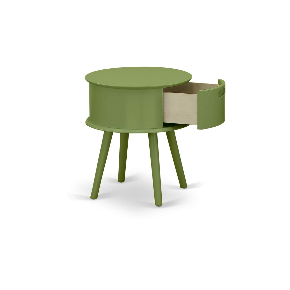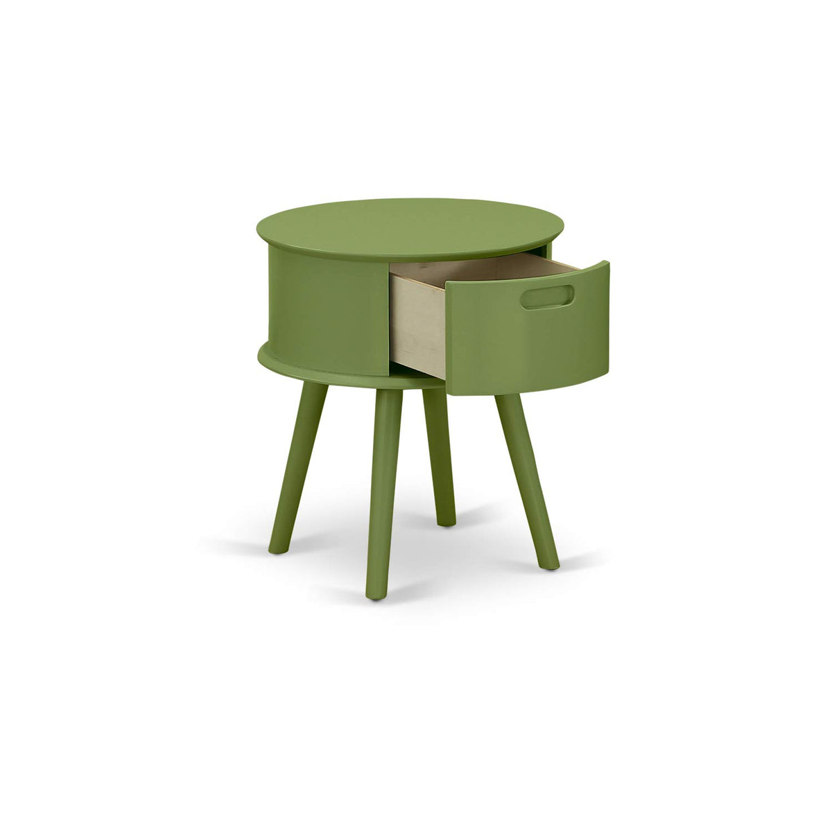 East West Furniture - Gone12 - Gordon Nightstandexperience The Trendy Sophistication Of Our Gordon Bedroom End Tables, Which Bring A Touch Of Elegance To Your Bedroom With Their Exquisite Nightstand Design. At Simple Beauty Furniture, We Believe In Combining Style And Affordability, And Our Versatile Round Top Nightstands Embody That Philosophy. Demonstrating The Beauty Of Simplicity, These Nightstands Feature A Single Door With A Plain Inset Panel And A Brushed Metal Pull, Serving As Their Only Embellishments. The Tapered Legs Provide A Natural Contrast, Enhancing The Overall Aesthetic. Additionally, The Wood Nailhead Accents Lend A Handmade Touch To The Piece. Crafted From Asian Wood, These Nightstands Are Available In Clover Green Or Natural Finish Options. Add A Touch Of Timeless Charm To Your Living Space With This Beautiful Round-Shaped End Table. The Assembly Process Is Hassle-Free, Allowing You To Customize Its Placement. The Unique Design Of This Compact Nightstand Seamlessly Complements Any Decor Style.Product Features: Material: Rubberwood Color: Clover Green Measurements: Length: 19.6; Width: 19.6; Height: 22.Include: 1 Stunning Night Table For Bedroom.