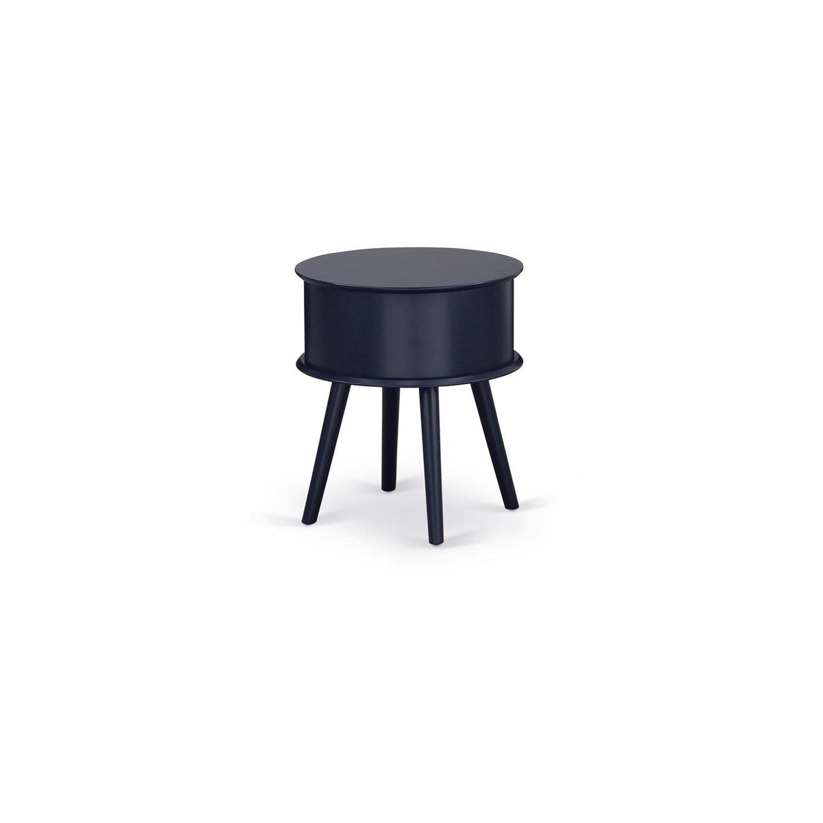 East West Furniture - Gone15 - A Beautiful Nightstand Tableenhance The Aesthetic Appeal Of Your Bedroom With Our Stylish Round Table Nightstand, Which Adds A Touch Of Elegance. This Versatile Nightstand From Our Collection Of Minimalist Furniture Combines Affordability And Sophistication. Demonstrating That Simplicity Often Holds Greater Charm, The Single Door Features A Plain Inset Panel And A Brushed Metal Pull As Its Sole Embellishments, While The Tapered Legs Provide An Exquisite Contrast. The Wooden Nailhead Accents Give The Piece A Handmade Appearance And Texture. Crafted From Asian Wood, This Nightstand Is Available In Navy Blue Or Natural Finish. Elevate Your Living Area With This Delightful End Table In A Round Shape. Its Timeless Design Seamlessly Blends With Any Decor, Allowing You To Assemble And Modify Your Space As Desired.Product Features: Material: Rubberwood Color: Navy Blue Proportions: Length: 19.6; Width: 19.6; Height: 22.Include: 1 Attractive End Tables Bedroom