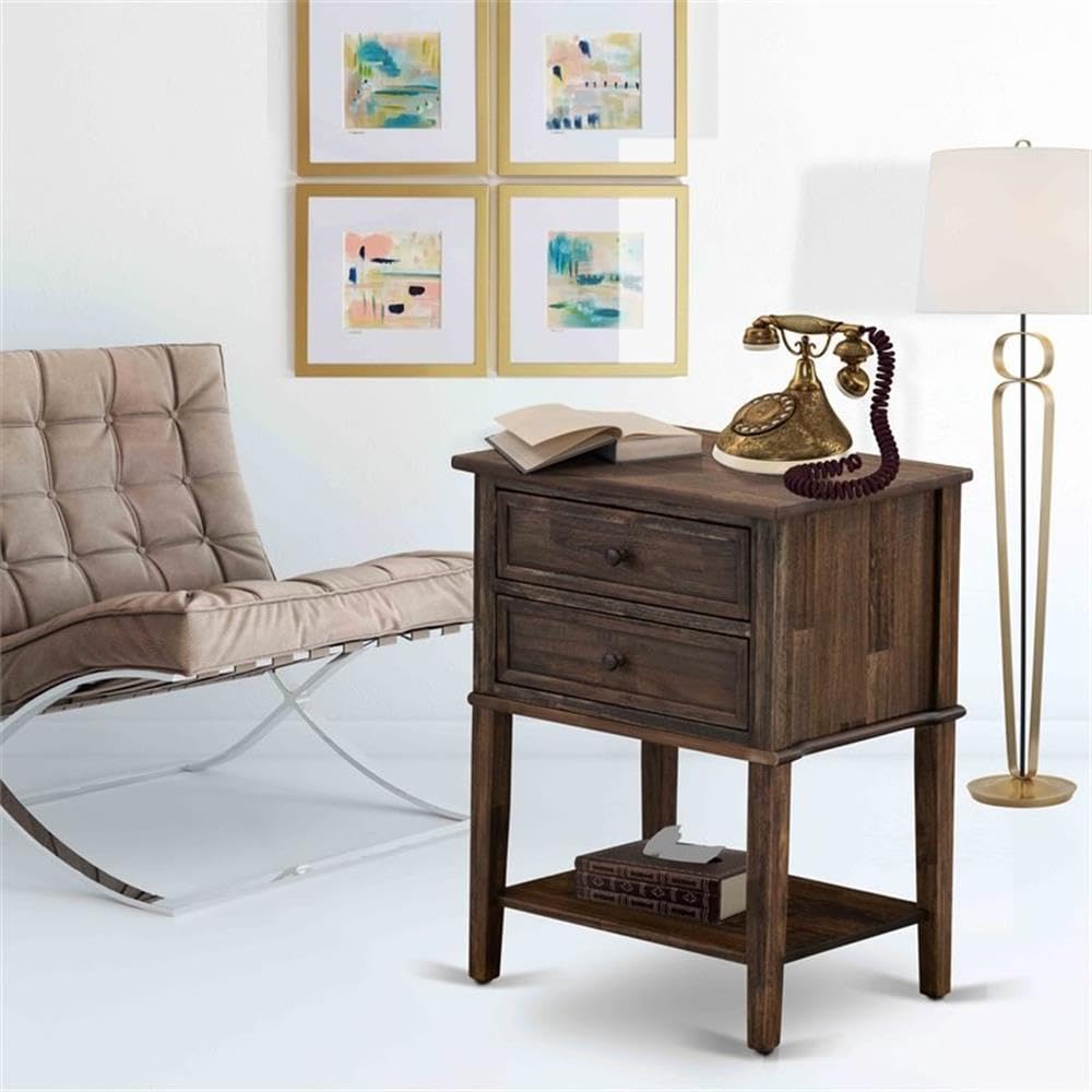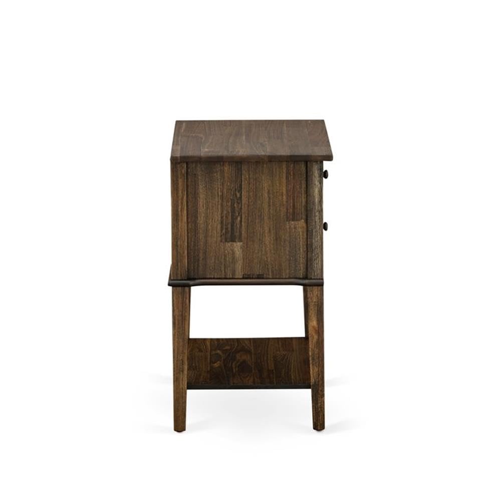 EAST WEST FURNITURE - VL-07-ET - SMALL END TABLE WITH WOODEN DRAWERThis elegant wooden side table constitutes a distinguished addition to any residence, embodying both form and function. The resplendent color of this exquisite end table reflects opulence and durability, imparting an element of sophistication to your interior decor. It provides a secure and dependable means of organizing all your essential items within your living space. This modest yet innovative bedroom nightstand represents a contemporary reinterpretation of a traditionally designed table. Crafted from rubber wood, this modern mid-century nightstand stands as a testament to sturdiness and longevity. Precision in craftsmanship, coupled with the symmetrical distribution of its four legs, underscores the overall frame's structural integrity and ensures abundant stability. A practical lower shelf facilitates the systematic arrangement of your most frequently accessed books and magazines. This splendid mid-century end table not only offers ease of maintenance but also proves to be a prudent choice for budget-conscious households. Assembling the table is a straightforward process, with all the essential hardware and tools conveniently included. Furthermore, our mid-century modern end table lends itself to effortless cleaning and consistently enhances the aesthetic allure of your living space.NIGHT STAND FOR BEDROOM FEATURES: Material: Asian Wood Color: Distressed Jacobean Dimensions of Night Stand: Length: 22; Width: 15.7; Height: 28.Package Included: 1 End Table