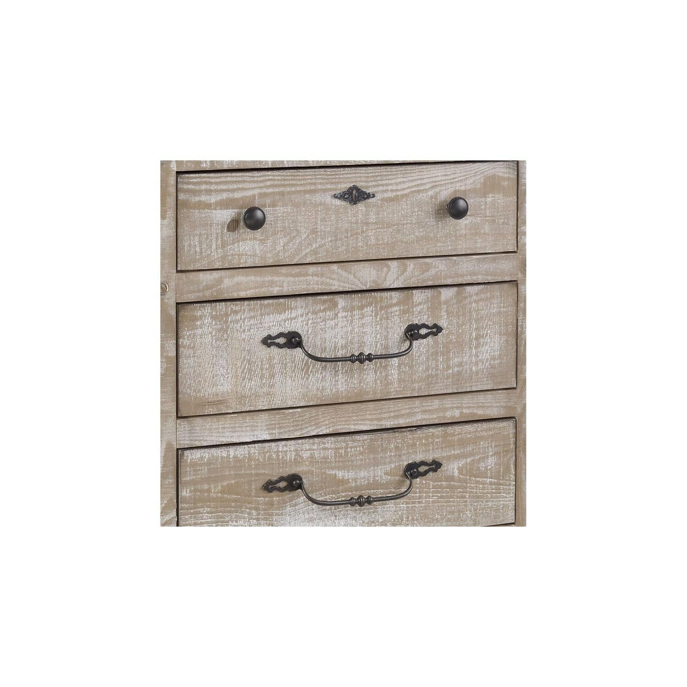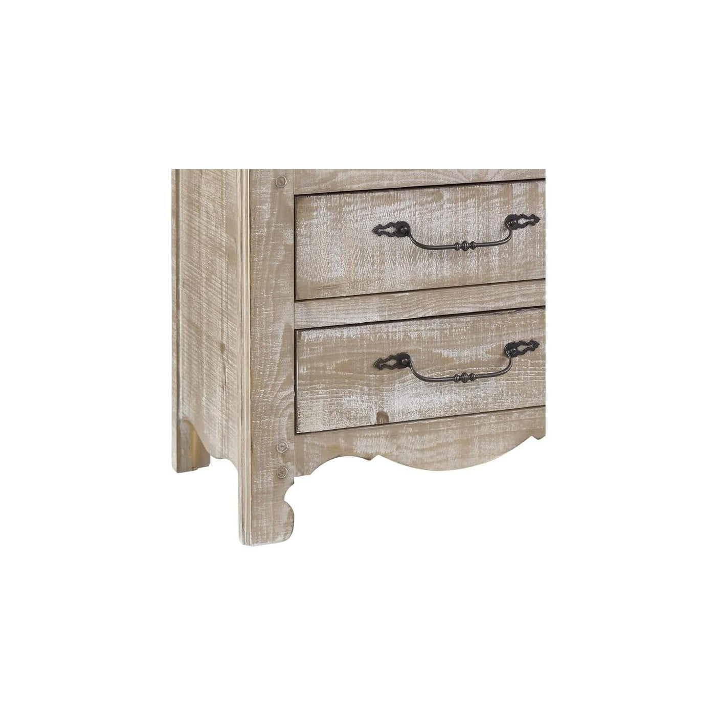 This Nightstand Features Scalloped Base Molding, Round Hole Peg Detail, Rounded Front Corners In A Rough Sawn Pine Tongue And Groove Construction. Unique Oversized Hardware With Decorative Bale Pull, Knobs And Keyhole Escutcheon Finished In A Dark Bronze. Solid Pine Dado Drawer Construction With Metal Center Drawer Guides. This Chalk Finish Is Hand Applied On Rough Sawn Pine To Achieve A Vintage, One Of A Kind Look.