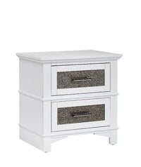 This Dazzle Nightstand Has Just Enough Glam To Grab Your Interest! This Beautiful White Finish Contrasts Perfectly With The Pewter Colored Inserts. Features Include Undertop Molding, Molding Between The Drawers, And Shaped Base Rail. Two Drawers Of Storage With Removable Black Nickel Finished Drawer Pulls.