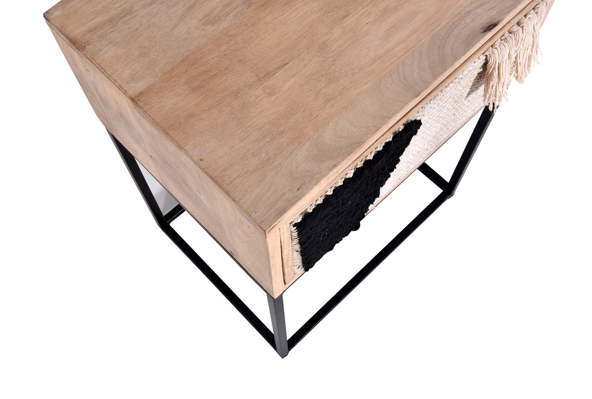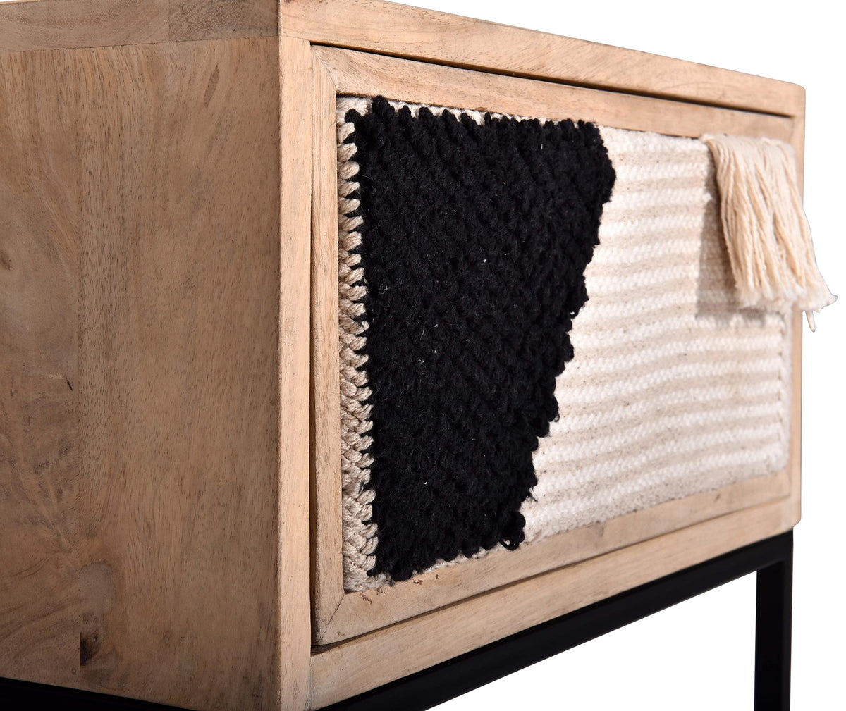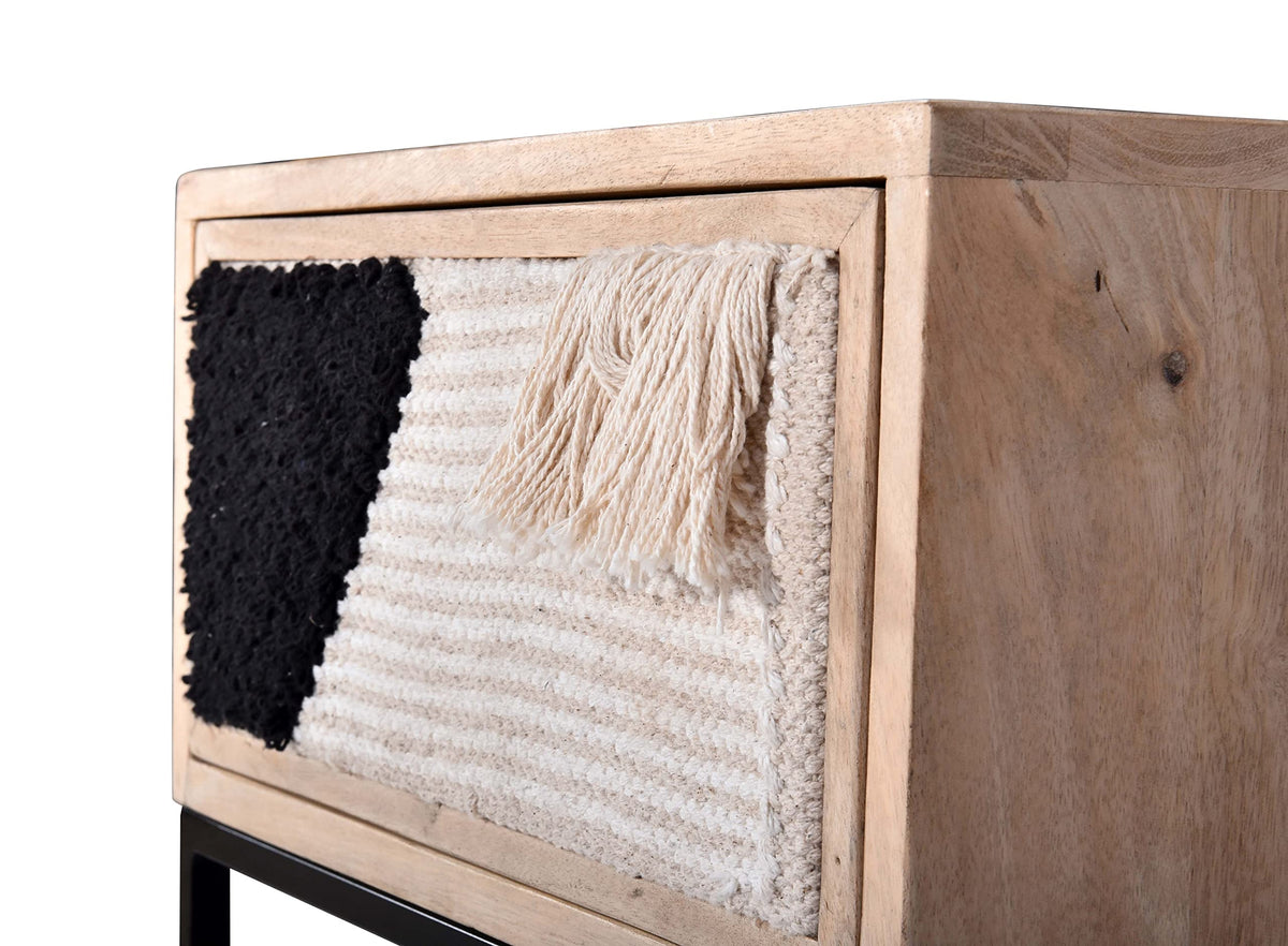 Dare to be different. These fun stylish little boho numbers are just what you need. Simple box shapes with action packed drawer and cabinet fronts. Dressed in woven jute with different color and texture variations. Call it “sensory overload” on your table that’s trend setting. The black metal base is simple and unobtrusive. Drawer and cabinet hardware is modern and finishes off this design brilliantly Great for your bedroom, living room, or anywhere else that you want to add some sass.