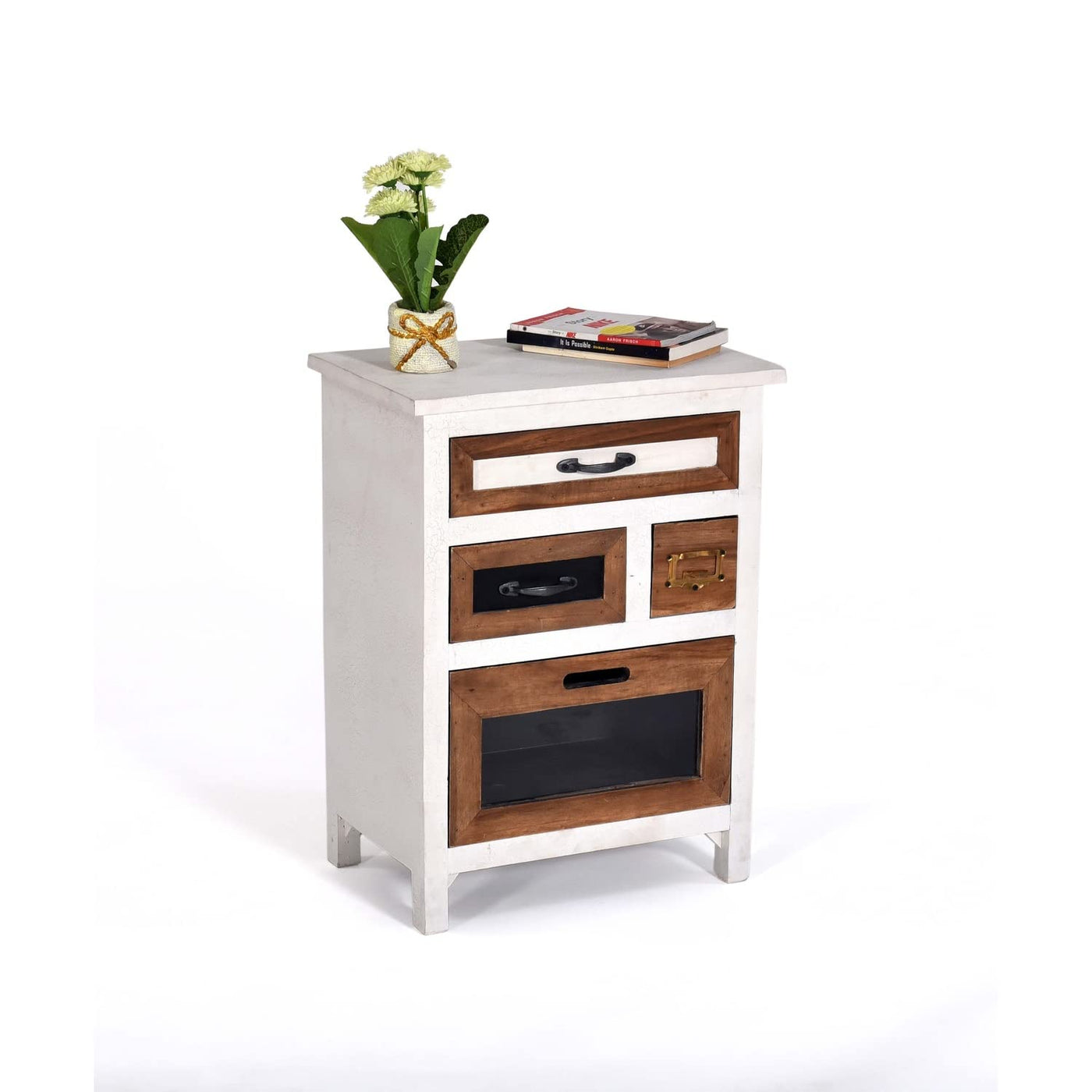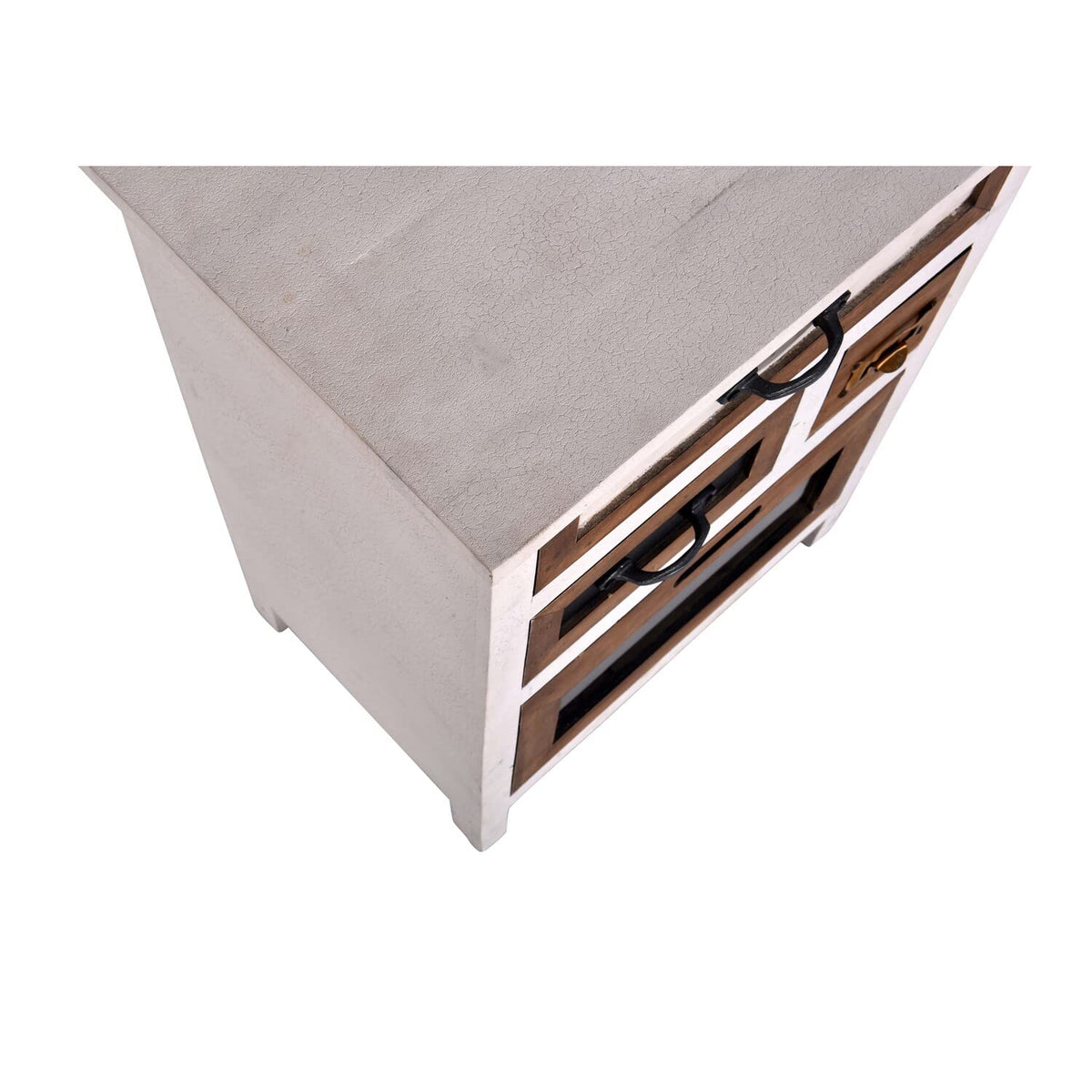 Fun & creative pieces to spice up any space. Constructed of mango wood with MDF and metal accents. White finish looks aged with a cracked paint technique for texture. A natural wood detail around each drawer and cabinet. Metal drawers not only add strength but looks incredible contrasted with the other finishes. These designs have so much detail and function. Perfect for bedrooms, living rooms, kitchens, even home offices.