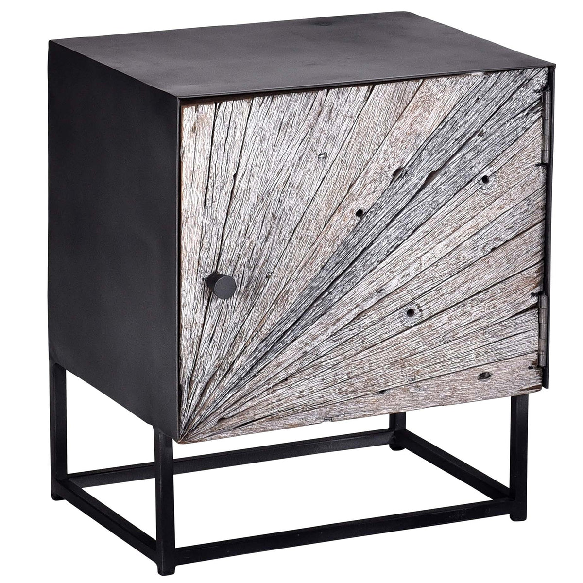 Reclaimed wood making quite the statement. These pieces are constructed of reclaimed mango, acacia, teak woods in an iron frame. Finished in a gorgeous dry whitewashed gray contrasted with a dark gray iron. The wood has an asymmetrical starburst pattern running at an angle throughout all drawers. Very cool designs with drawer and cabinet storage. Perfect for small space living.