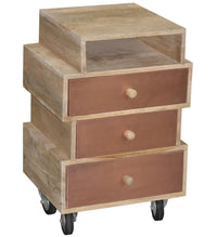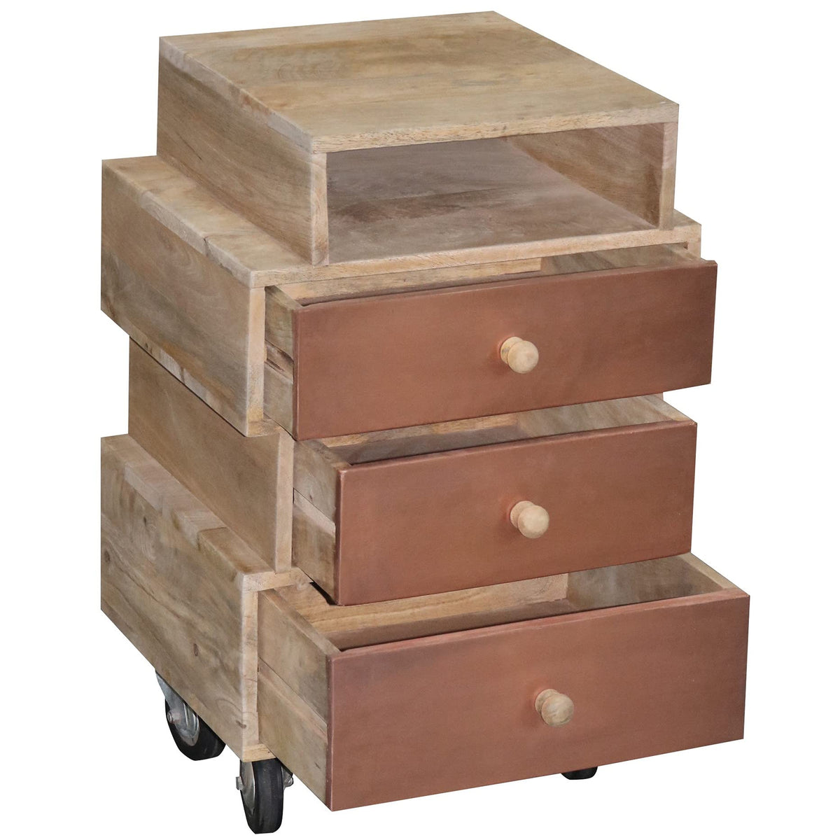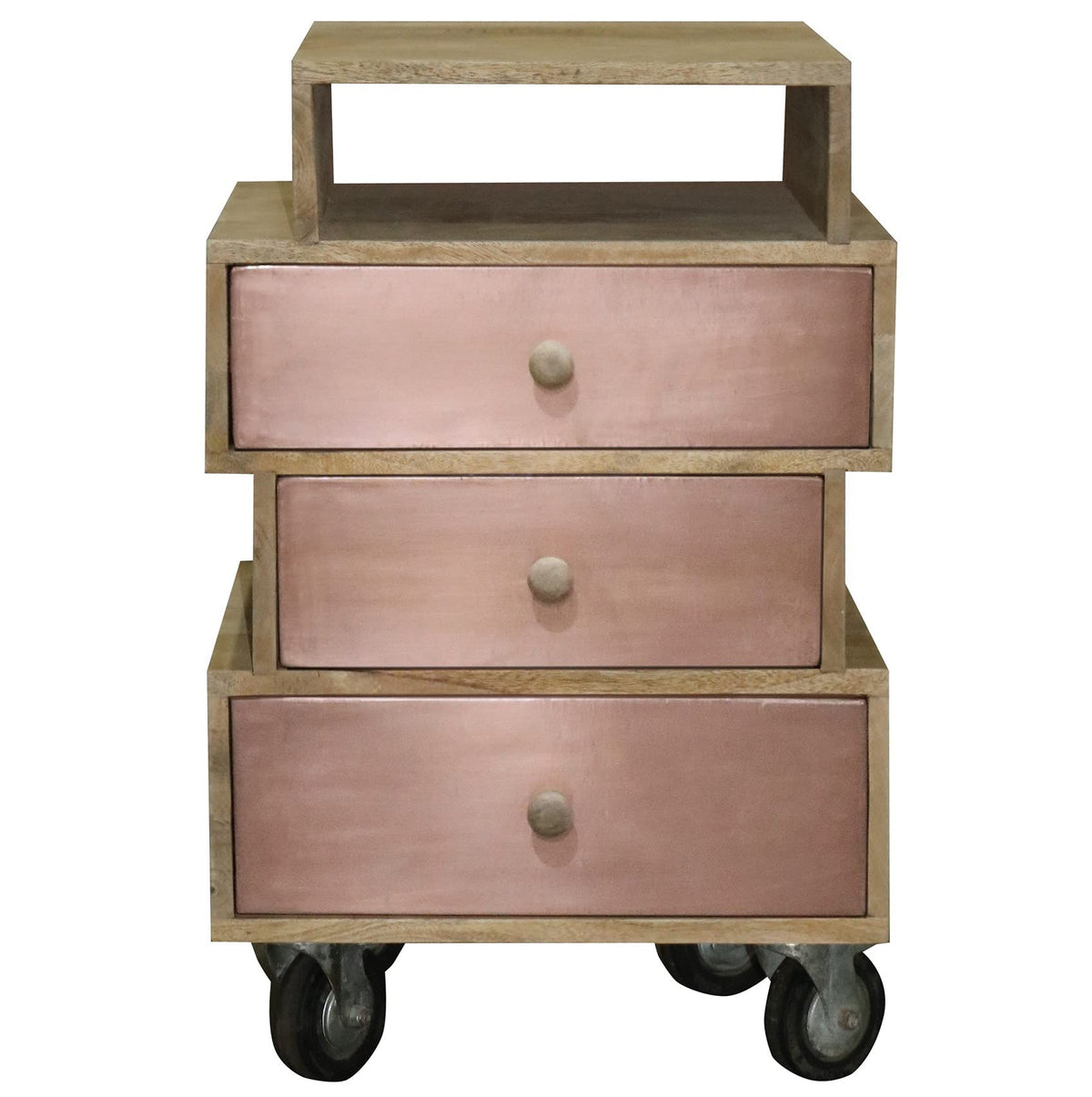 DescriptionHow fun is this? A great little nightstand or end table for those who want something different. Design is asymmetrical with an open shelf and 3 drawers for your storage needs. Drawer fronts have actual copper applied to the face and wooden guides for opening. It also has casters for ease of mobility. Since when did function look so good?