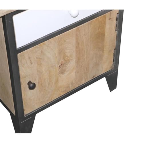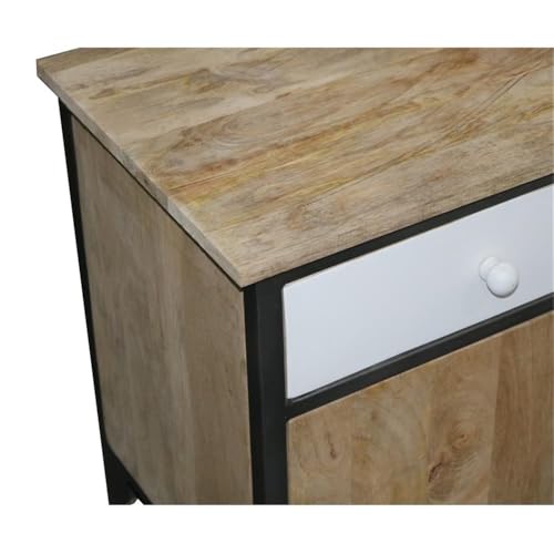 Smart, trendy and functional. A transitional style that will take you in any design direction you want to go. An industrial designed iron frame with mango wood drawer and cabinet in a natural finish and a crisp white color that is clean and modern. Vintage style hardware including cool bronze and white handles. So not only great looking functional piece but very interesting and different. A great way to add both sophistication and bliss to your living room, kitchen, bedroom, home office, and .. Never ending possibilities.