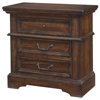 Make the warm and welcoming stone brook bedroom collection a part of your home. The rich Tobacco finish is lightly distressed giving character to this well crafted collection. The stone brook nightstand features 3 drawers for abundant storage along with detailed molding and hammered metal knobs and drawer pulls. To prevent Snagging, drawer interiors are finished and the top drawer is felt lined to protect your finer things. Purchase includes nightstand only.