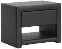 Hide all your bedtime necessities with style. Ideal for use alongside platform beds designed to rest very close to the floor, the petite Massey Designer Nightstand is made in Malaysia with a sturdy plywood and hardwood frame topped with a thin layer of foam padding and black faux leather. Storage features include a single drawer for all your bedtime necessities as well as a single open shelf. The modern bedside table, which comes fully assembled, is also available in white (sold separately). To clean, wipe with a damp cloth. Product dimension: 19.5"W x 13.75"D x 16"H, drawer(1): 13.75"W x 10.75"D x 3.37"H.