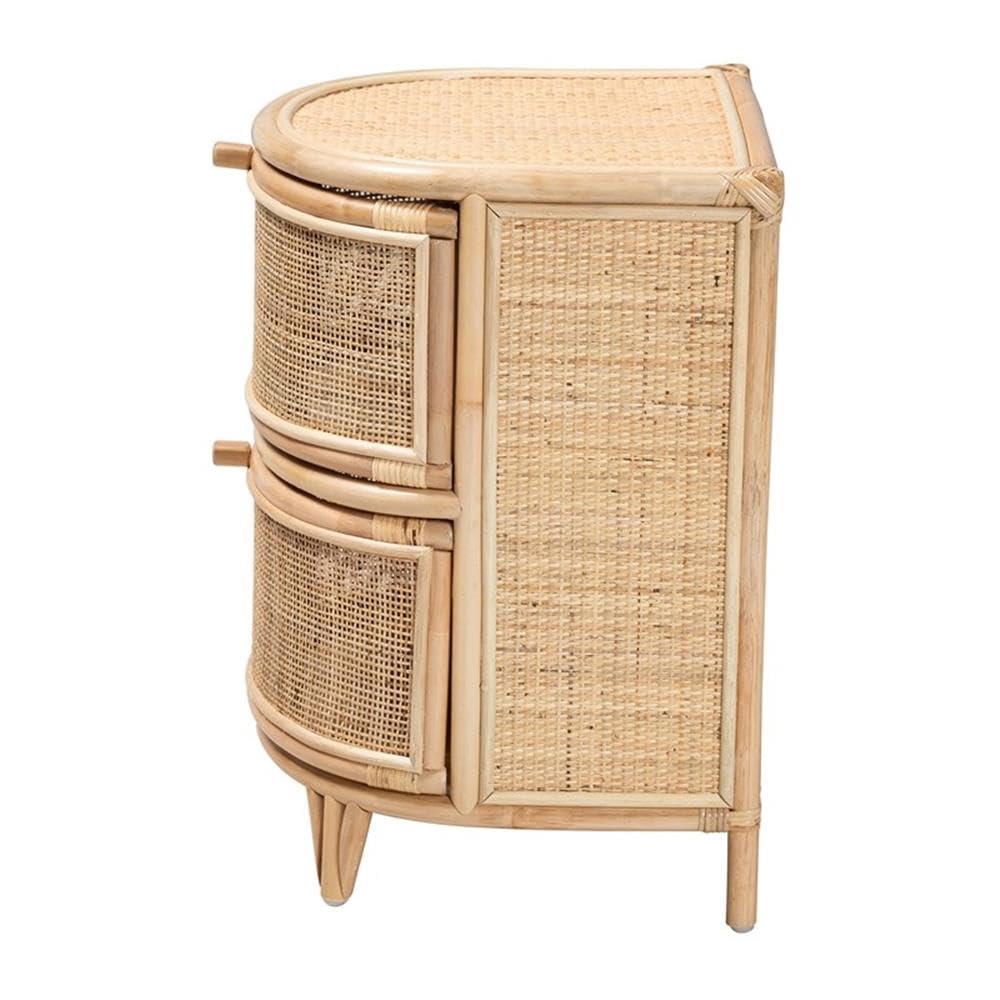Elegance in simplicity defines the charming Oleta nightstand. Hand crafted in Indonesia, this Bohemian inspired piece is crafted from natural rattan. Its curved silhouette is fitted with two drawers to efficiently organize bedroom essentials while reserving the tabletop for nightly use. The Oleta will arrive fully assembled and features a compact depth to easily blend with the exterior layout of any environment. Offering a dash of rustic flair, the Oleta nightstand is sure to become a staple of any layout.Due to the nature of the natural materials used in this product, it may have variations in areas such as, but not limited to, color, pattern, grain and texture. The hair-like strands of rattan/rattan-fiber are common due to nature of the material.