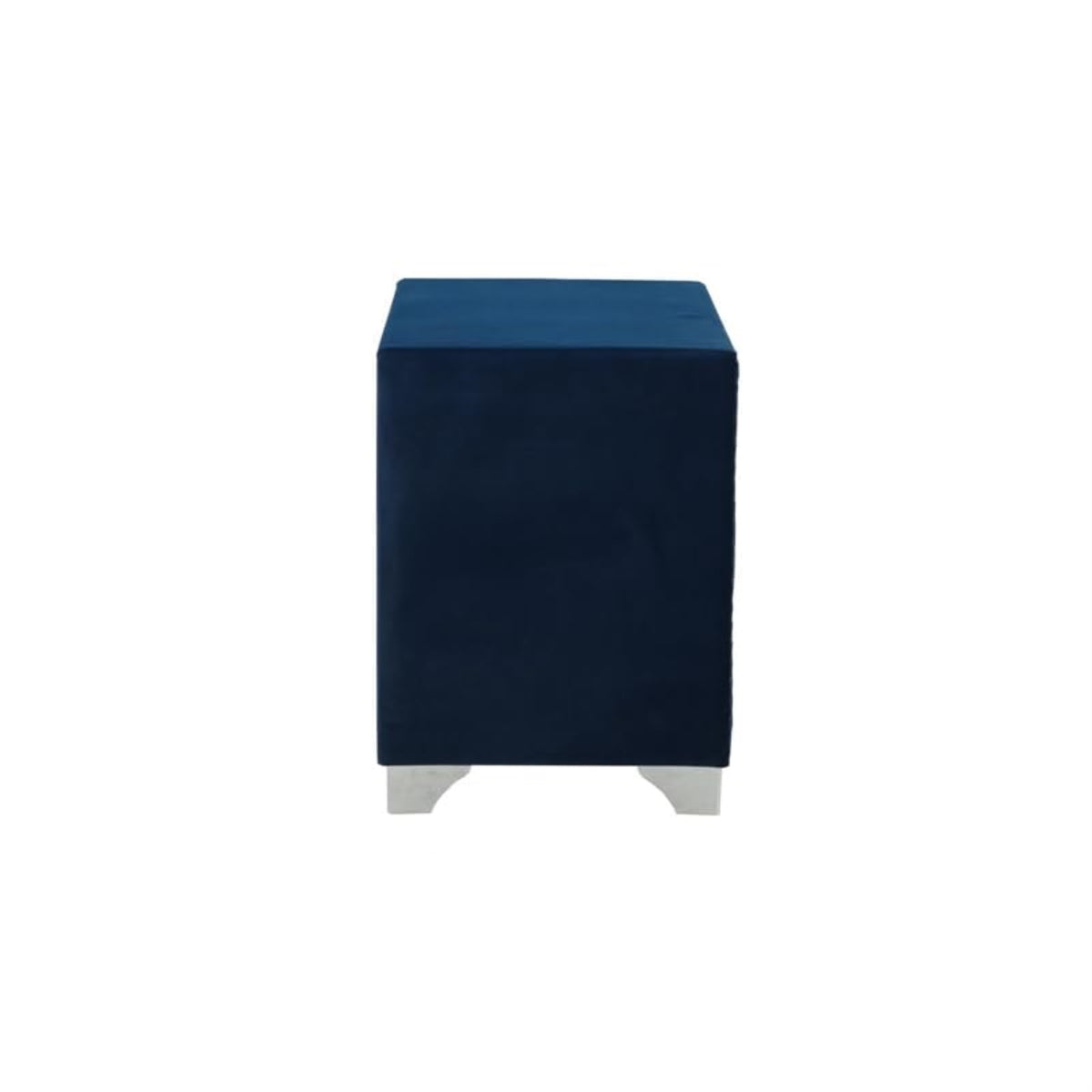 You've never seen furniture so elegant until this nightstand entered the picture. Entirely upholstered in velvet, this nightstand is a conversation starter. It has two spacious drawers to store your bedside items. Nail head trim makes a glorious statement that matches the tapered legs. With its stunning and regal design, this nightstand will make your sleeping space feel like royalty.FeaturesCreate a grand and glamorous feel in your bedroom with an elegance that will refresh your thoughts every time you enter Entirely upholstered with matte velvet in options of pacific blue or grey accented with crystal and chrome pull handles Chrome finished metal legs and hand applied nailhead trim amplifies the design's contemporary expression Exquisite with an impressive plush, matte velvet cover Unbelievable value and exclusive to CoasterDimensions:NightstandAssembled Product: 24 inches wide x 19.5 inches deep x 25.5 inches high Weight Capacity: 300 poundsAt Coaster, we are your premier source for exquisite furniture, offering diverse styles to enhance every aspect of your life. Our passion for excellence drives us to innovate, crafting budget-friendly furniture that complements your lifestyle. Explore our brands for endless design inspiration and make your living experience exceptional with thoughtfully designed, affordable pieces that inspire a life well-lived.