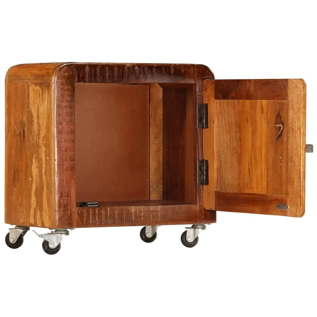 This classic-style wooden bedside cabinet exudes a vintage charm. It will surely make an eye-catching addition to your interior.The bed cabinet is made of solid reclaimed wood which has been sourced from joists, floors and support beams from old buildings being demolished, and additionally it is capable to consist of different types of wood like pine, teak, beech, oak, cedar, mango wood, acacia, etc. This means the reclaimed wood retains the characteristics of these different types of wood. Reclaimed wood is already aged, weathered and dried, and consequently it doesn't shrink or bend. This nightstand is fully handmade and the nice-looking wood grains make every piece of furniture distinctive and slightly different from each other. The metal hardware adds the cabinet's industrial style. This box cabinet provides space for storing your books, notepads, pens, as well as other knick-knacks. Equipped with 4 casters, the cabinet is easy to move around.Important note: The colors vary from piece to piece, making each piece unique; the delivery is random.Material: Solid reclaimed woodDimensions: 19.7"x11.8"x19.7" (W x D x H)Finish: Polished, painted and lacqueredWith 1 doorWith 4 casters